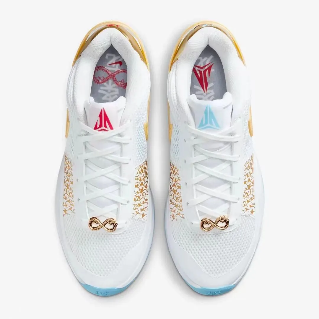 鞋款采用防撕裂网布和皮革材质,以白色为主色调,辅以冰川蓝和金属金妆点鞋面,同时鞋带处带有 8 字样的金色龙,彰显龙年主题,同时寓意着吉祥如意、八方来财,鞋侧面点缀有龙鳞图案,最后以白色中底和蓝色外底设计,又增加了鞋子的耐磨性和抓地力。
