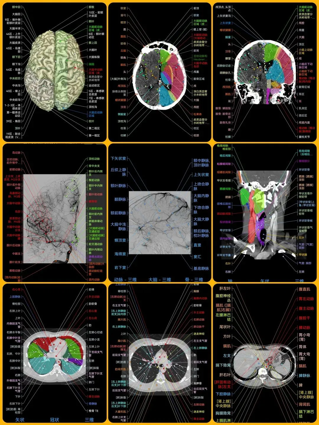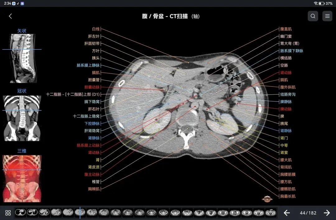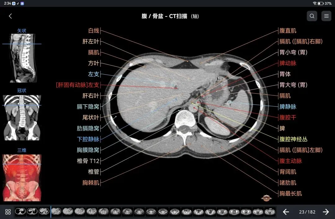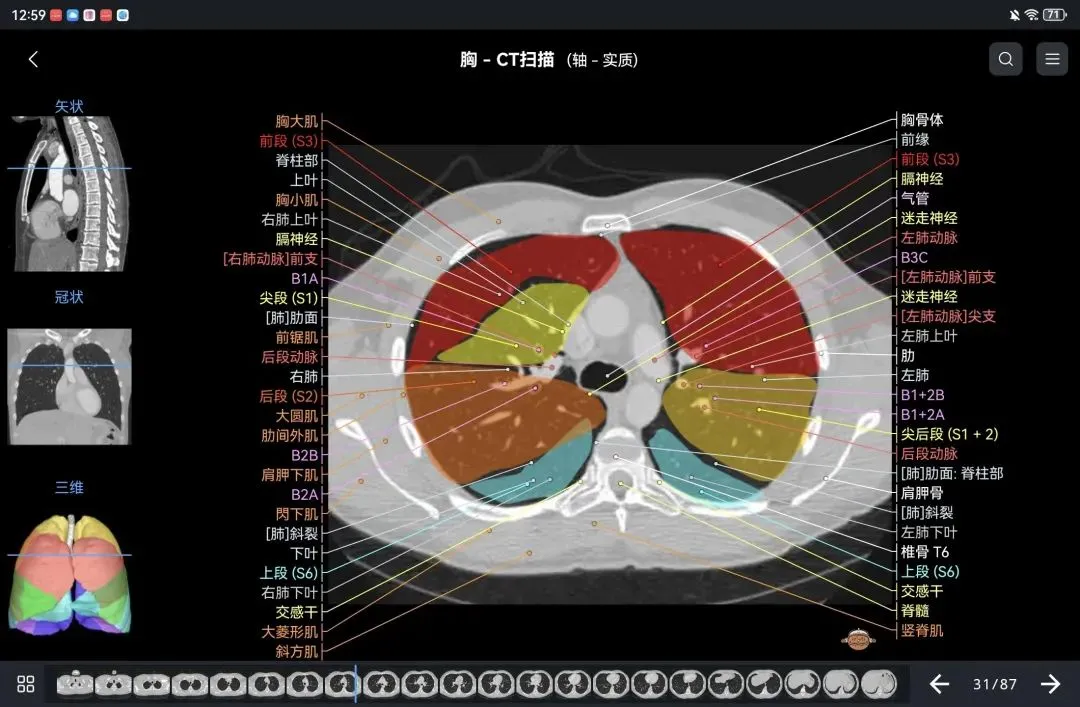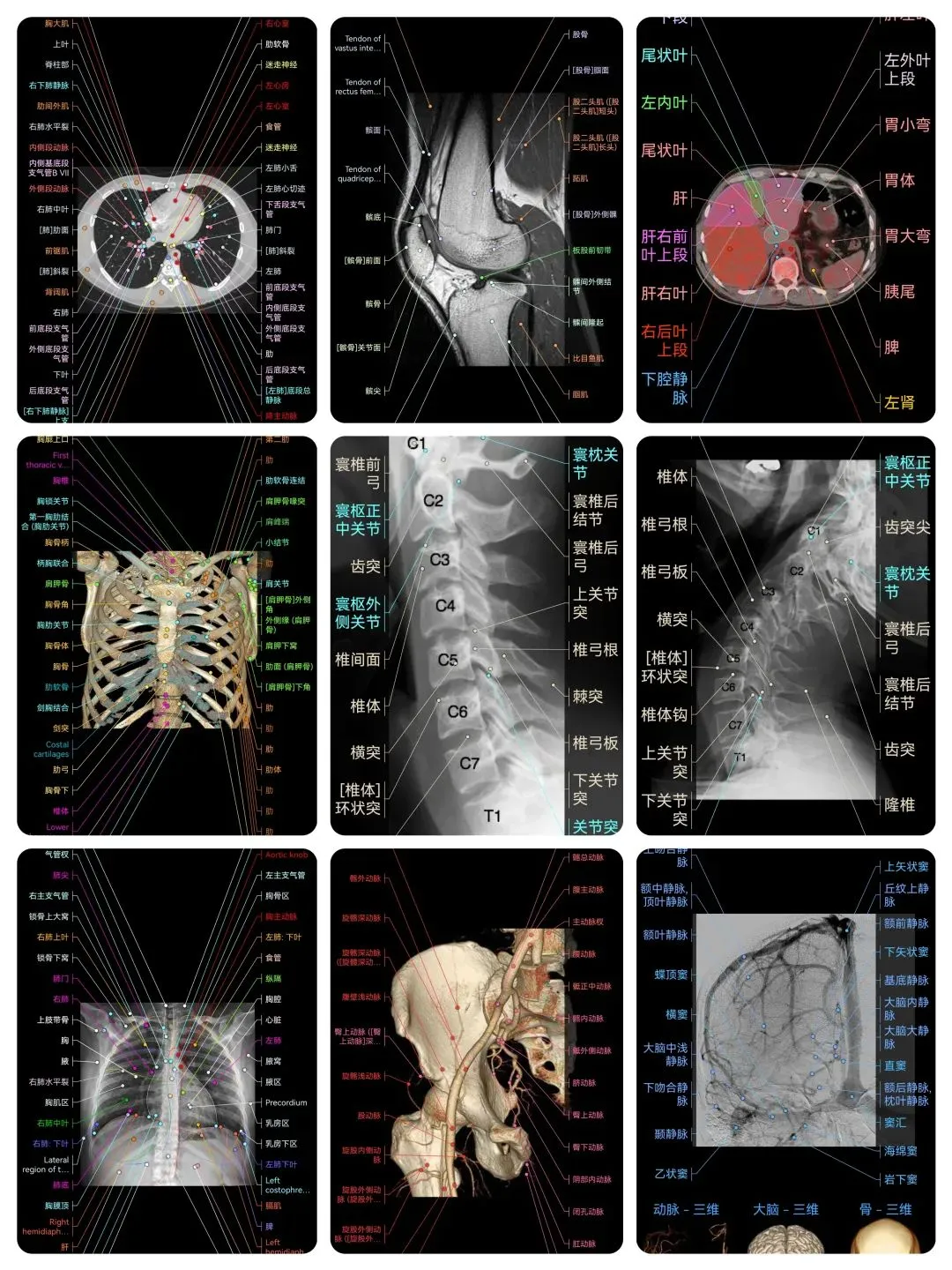 覆盖了X光、CT、MRI、断层大体解剖、核医学、介入造影、医学插图等多个模块,覆盖全身各个系统的影像解剖(正常解剖结构,无病例),其中的解剖结构高达87万个,结构标注超精细,超高清图像,历时两年研发设计完成✅。