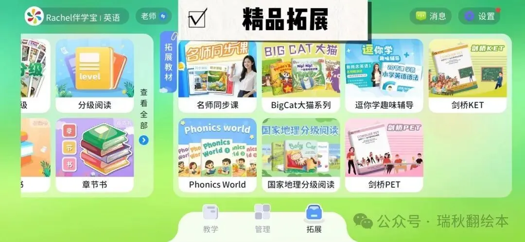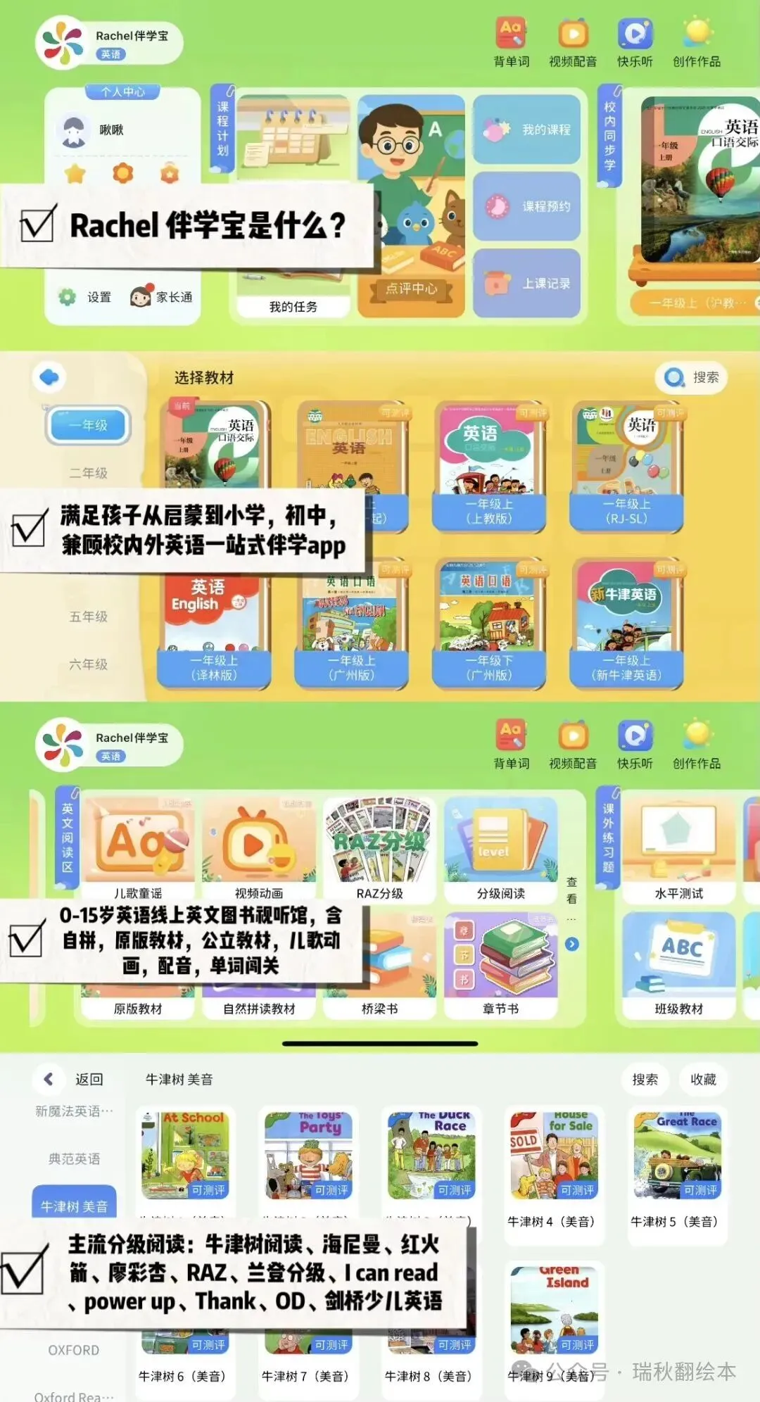 「Rachel伴学宝」涵盖国际知名出版社的分级读物和原版教材,其中分级读物包括RAZ、牛津树、海尼曼、培生英语、红火箭、丽声分级等主流分级读物,原版教材则包含新概念,剑桥少儿英语,Oxford Discover,Power Up,Reading Explor, Think,Guess What,Great writing,Let’s go, wonders, Super minds,Wonderskills,unlock全系列。