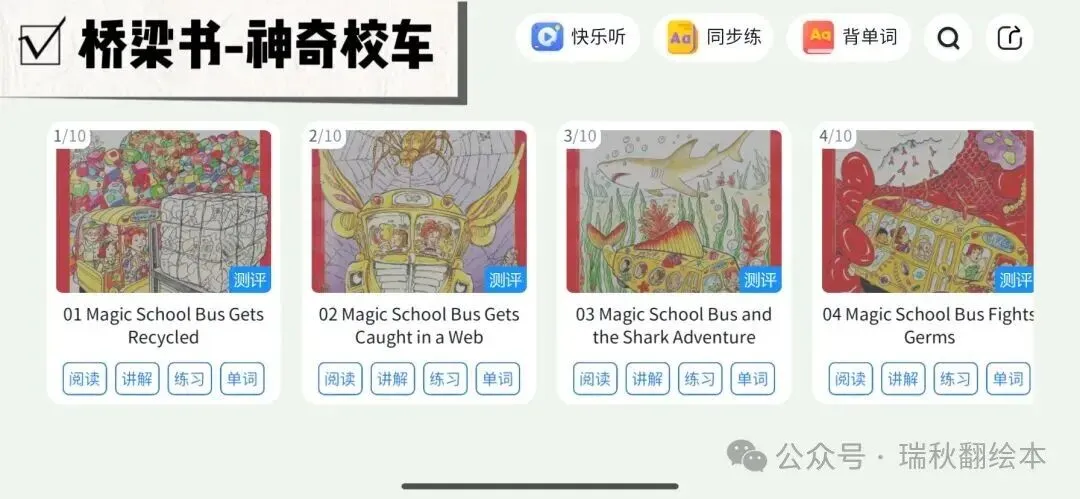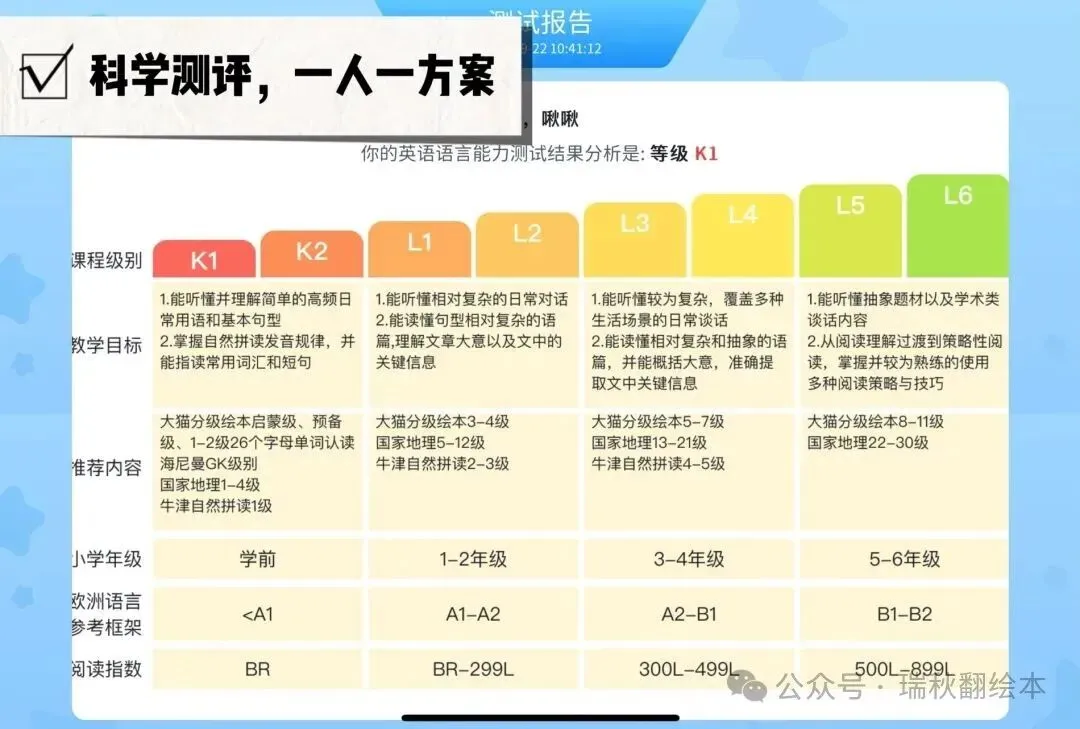 系统根据孩子的测试水平推荐合适等级的读物,每本书都配有: