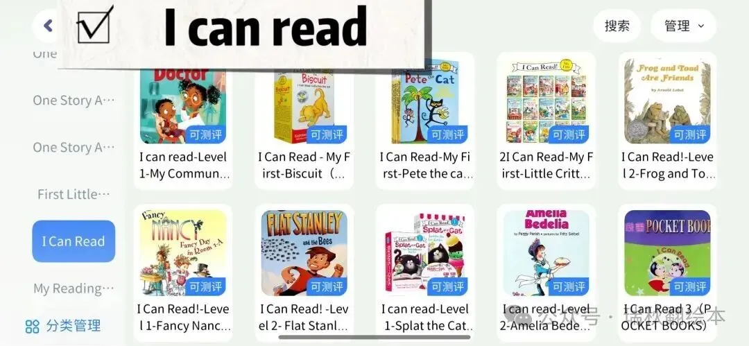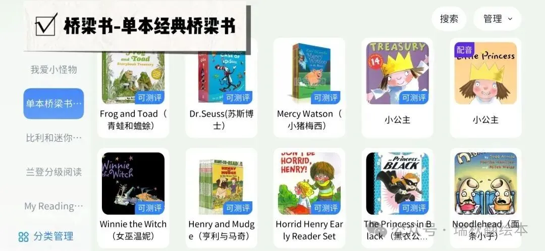 苍蝇小子,小猪小象,我爱小怪物,Frog and Toad,神奇校车,小猪梅西,Nate and Great,Junie B. Jones,Dog man,糊涂女佣,小狐狸,淘气包亨利,亨利与马奇,苏斯博士,青蛙与蟾蜍,驯龙高手,小公主等