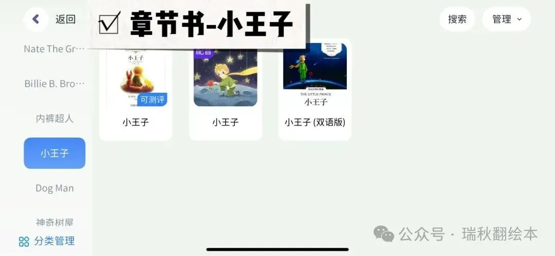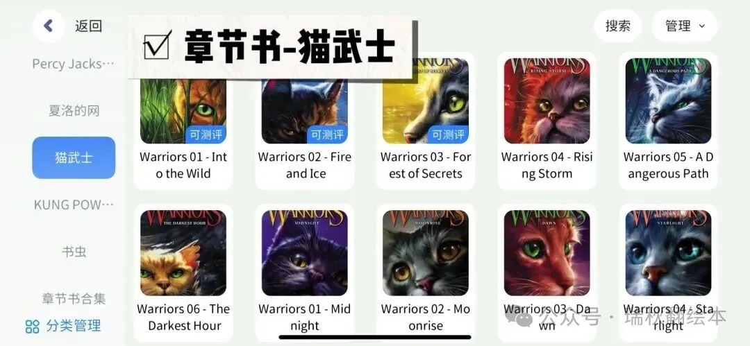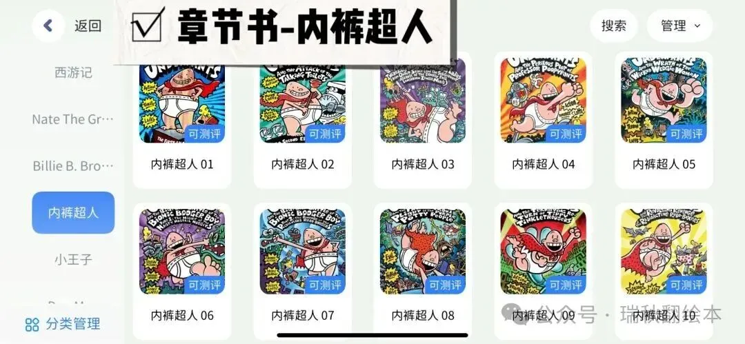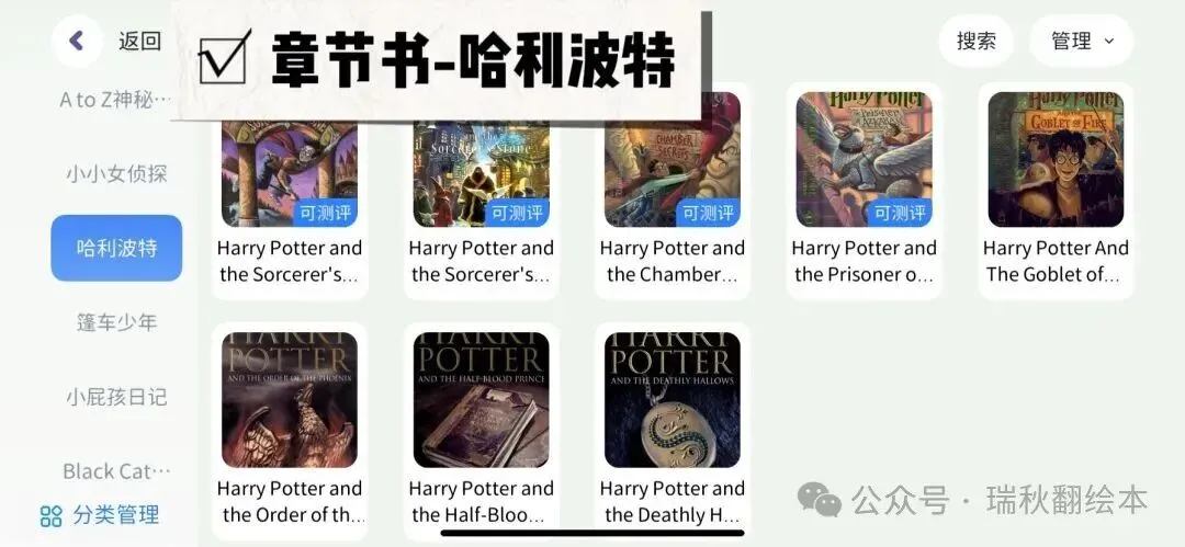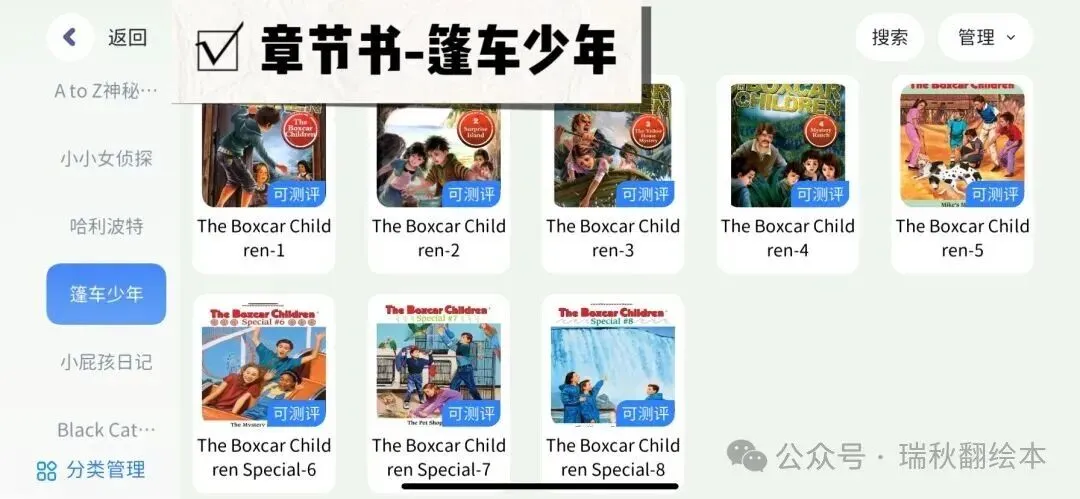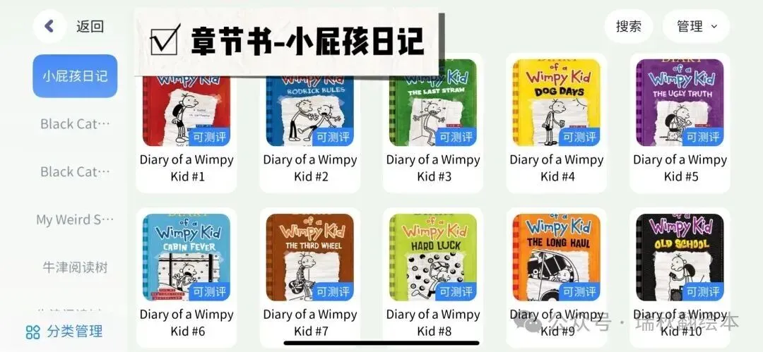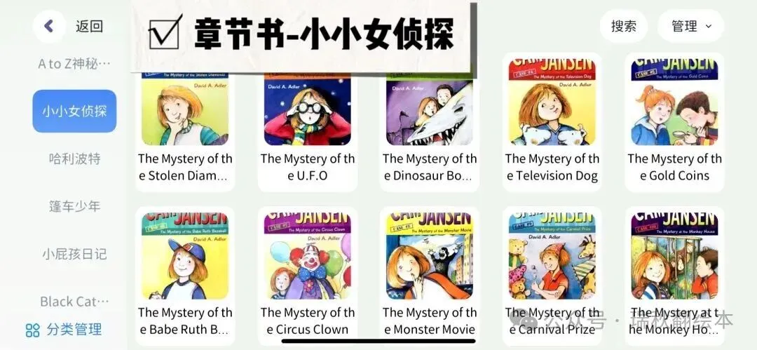 小屁孩日记,西游记,哈利波特,驯龙高手,纳尼亚传奇,书虫,老鼠记者,棚车少年,神奇树屋,人物传记,小小女侦探,黑猫中级,黑猫高级,神奇树屋,Dog man,侦探内特,宫保鸡丁,Ato Z神秘案件,英语经典,罗尔德达尔,小王子,Prey Jackson,夏洛的网,猫武士,伊索寓言等