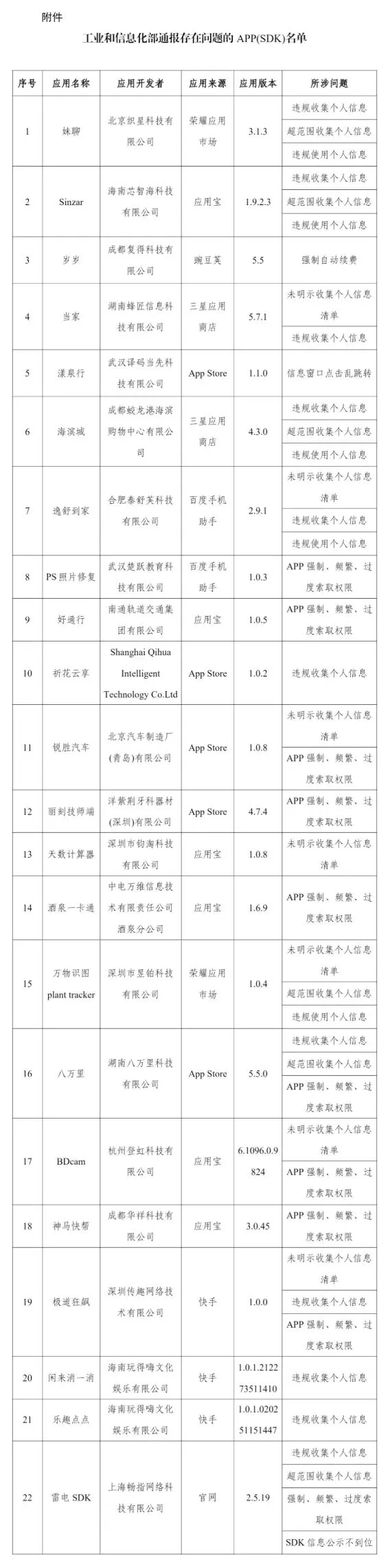 赶紧自查!22款APP被通报 据工业和信息化部官网消息,近期,工业和信息化部组织第三方检测机构进行抽查,共发现22款APP及SDK存在侵害用户权益行为。 工业和信息化部表示,相关APP及SDK应按有关规定进行整改,整改落实不到位的,工业和信息化部将依法依规组织开展相关处置工作。 图片来源:工业和信息化部官网 来源:人民网 关注“看台安”不迷路 👇👇👇 广告推文 商务合作:18242276543