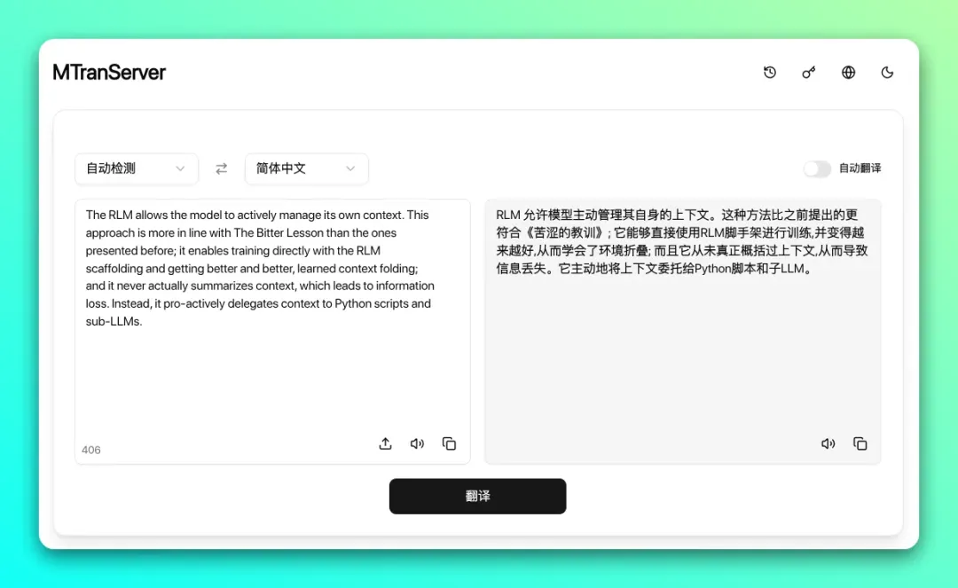 超低资源消耗速度超快的离线翻译模型服务器「MTranServer」支持全世界主要语言的翻译,无需显卡。单个请求平均响应时间 50 毫秒。提供了 macOS、Linux、Windows 跨平台部署,以及 Docker Compose 部署。