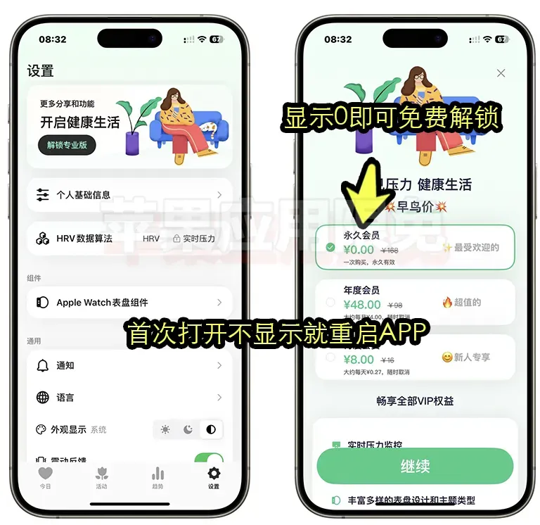 一款健康监测软件,旨在帮助用户实时了解自己的压力和情绪状态。目前软件终身会员限免,打开软件完成初始化就会弹出内购,显示价格就重启APP或者从设置顶部进入内购,显示0即可免费获取,设备需要iOS 15.6或更高版本。