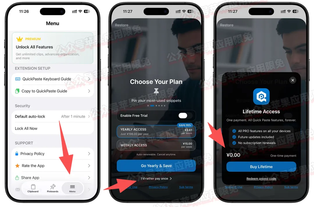 一款全面剪贴板存储与管理,目前可以免费获取它的完整版内购,打开软件从more顶部进入内购,选择I’d rather pay once,显示0即可免费获取,首次打开不显示就重启,设备需装有 iOS 16.0 或更高版本