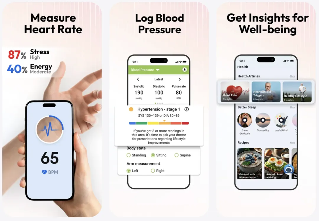 简介:一款脉搏、血压和人工智能健康追踪器。即时检测血压和脉搏、通过 心率监测器-心跳 跟踪压力、监测心脏健康,让您保持健康。更智能、更快速、更精准。您的一体化健康伴侣。轻松追踪心率、血压、糖尿病和 BMI 活动。设定目标,获取实时洞察,保持动力。