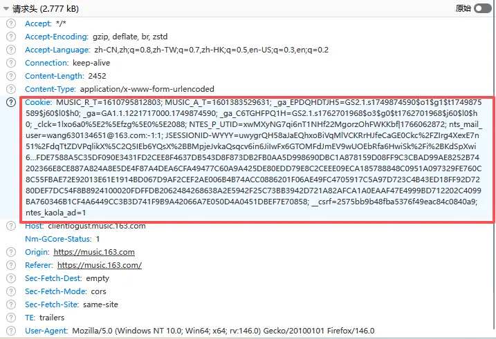 完整复制包含MUSIC_U和__csrf的字符串(格式如MUSIC_U=xxx; __csrf=yyy)