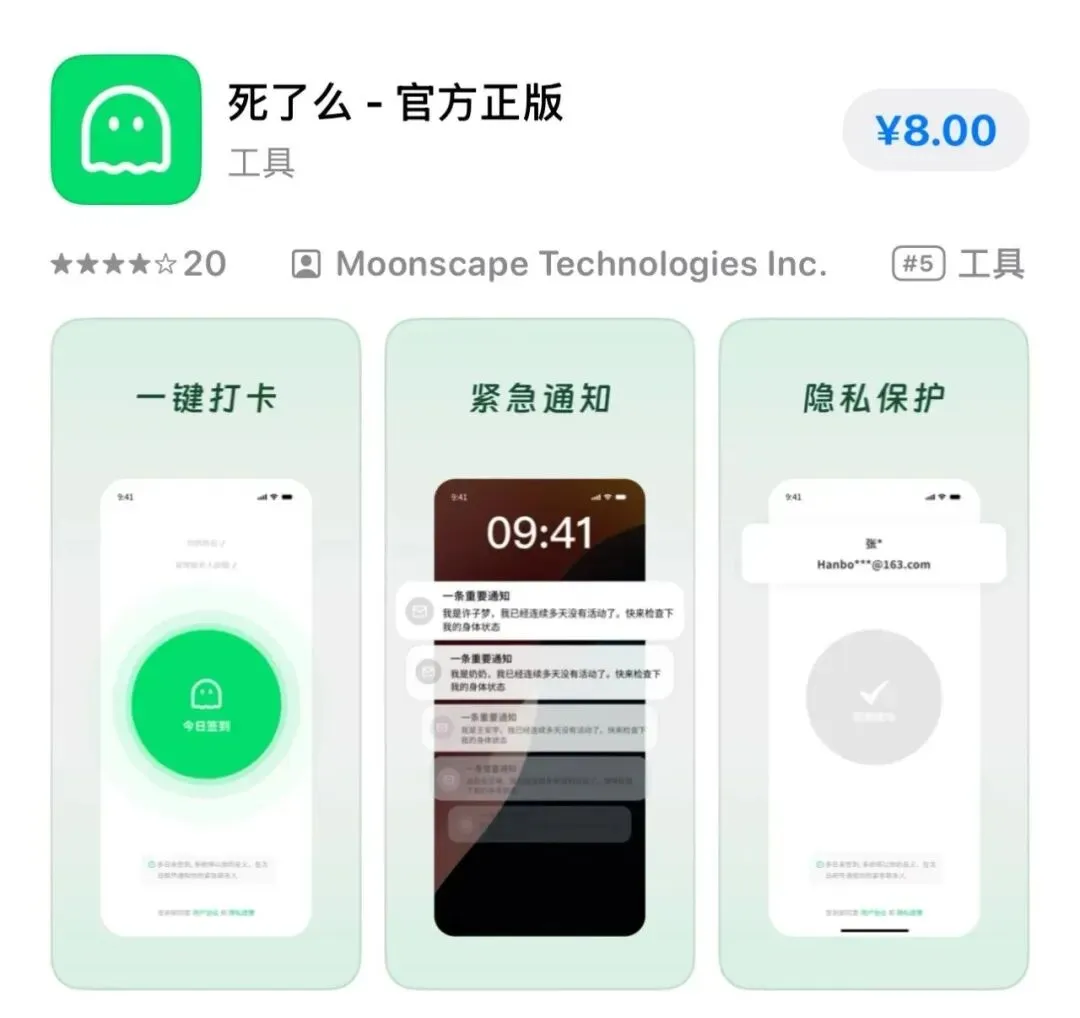 更绝的是,“死了么”想使用先得交8块钱下载,听说前几天还是1块钱来着,这涨价真是飞速啊。网友吐槽得精准:“8块钱,我是买个安心还是买个晦气?”嗨!纠结了十分钟,还是不舍得掏这个钱,就看看简介里的界面介绍吧。