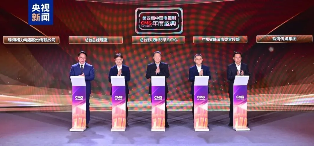 △中央广播电视总台影视剧纪录片中心副召集人夏晓辉,广东省珠海市委常委、宣传部部长徐剑,总台总经理室副召集人徐立军,珠海传媒集团董事长孙锡炯,珠海格力电器股份有限公司副总裁朱磊共同发布CMG中国电视剧年度盛典战略合作