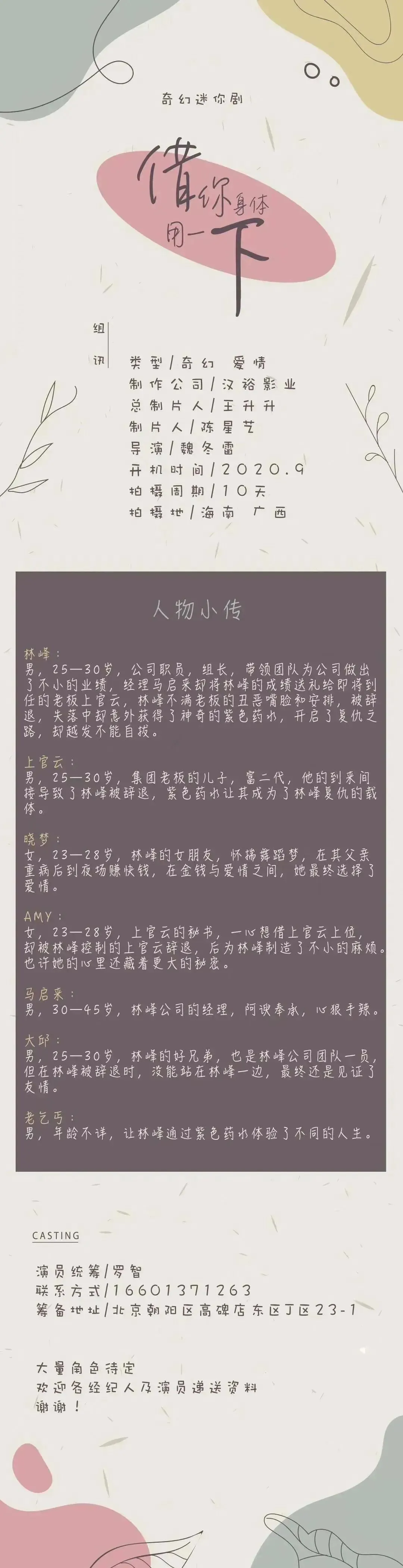 2020/7/10剧组招募精选,几部迷你短剧,演绎浪漫爱情,演员招募中!