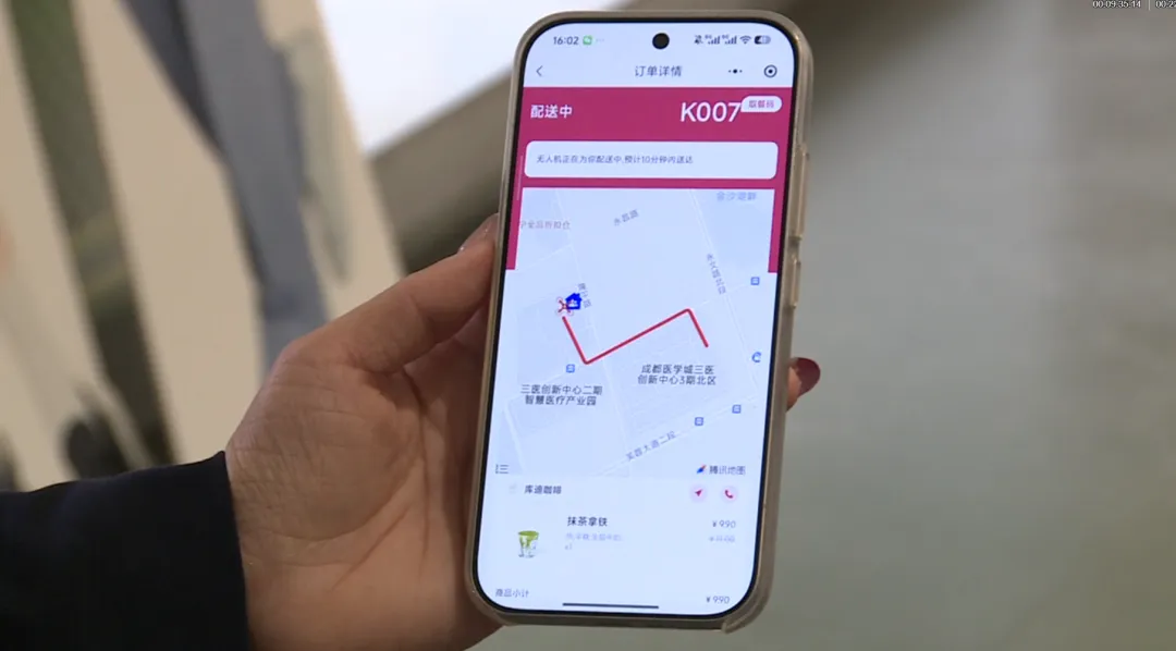 测试采用的P600无人机载重可达1公斤,可稳定承载4杯咖啡,飞行速度设定为3米/秒,在5公里半径内实现高效点对点配送。通过RTK实时动态差分定位技术结合4G模块,无人机实现了厘米级精准定位与可靠通信,确保在园区楼宇间指定区域平稳起降。飞行中,无人机先垂直上升至75米安全高度,避开障碍后沿道路空域精准飞向目标。配送全程,用户可通过小程序实时查看无人机飞行轨迹,订单状态与飞行数据实时同步、全程可视。