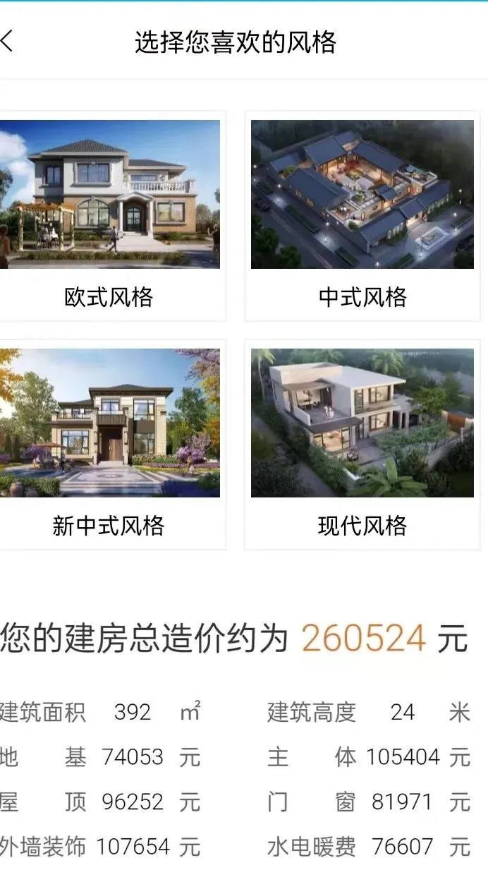 客户根据自己的要求,挑选建房风格,建房尺寸,进行造价测算。可以初步的测算出建房所需的造价明细,给我们建房做一个参考。
