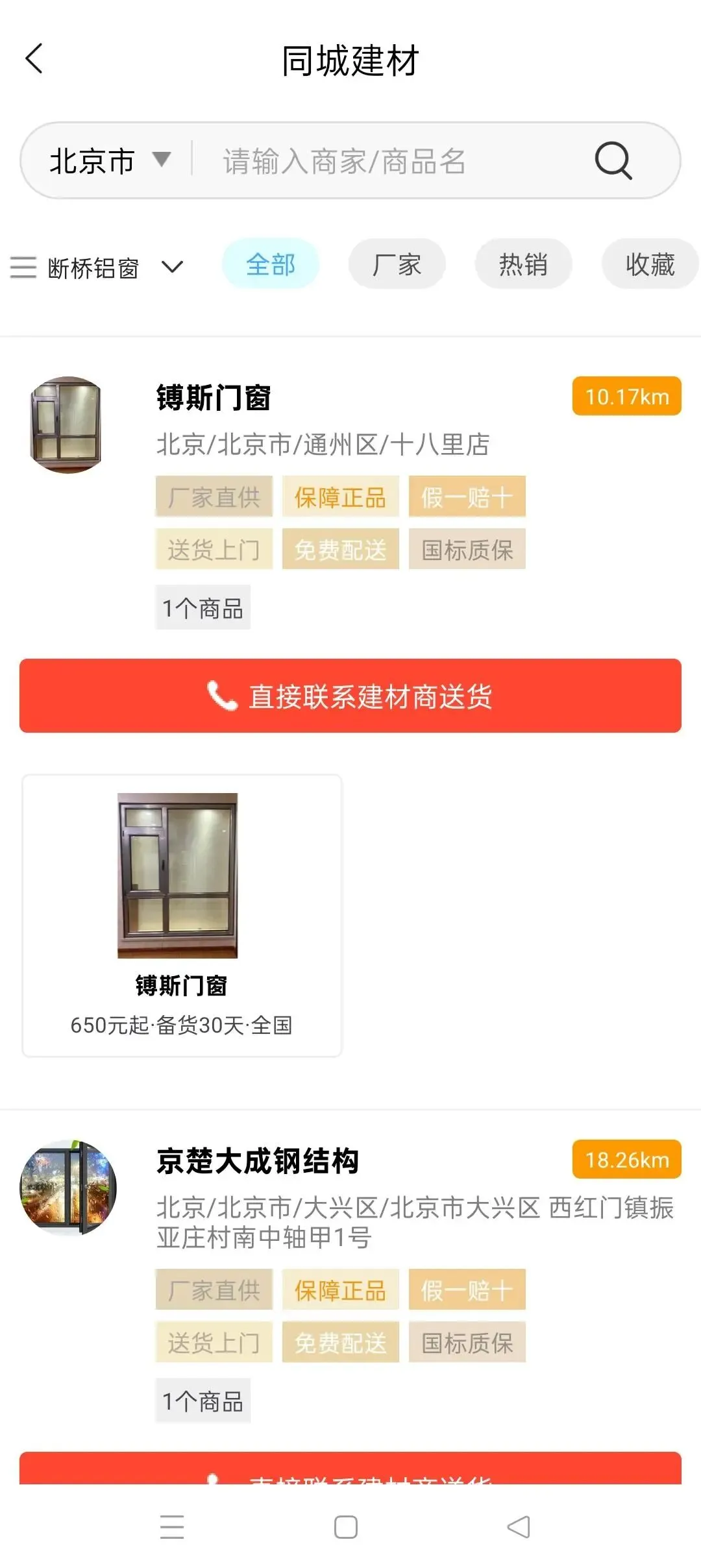 建材商入驻后可以上传建材商品,在前台展示后,施工对于客户可以根据所在城市进行设置挑选附近的建材。客户可以点击联系商家,进行直接沟通,达成成交后直接送货上门。