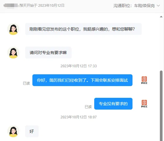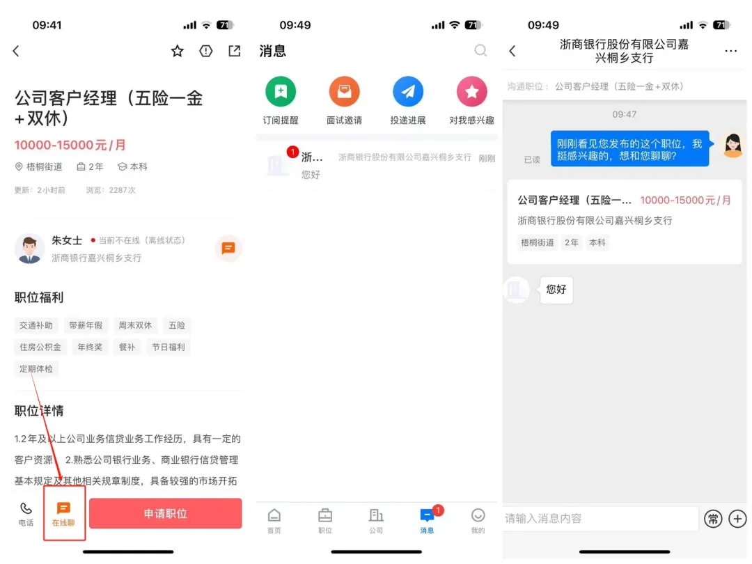 打开岗位点击“在线聊”与企业HR在线沟通