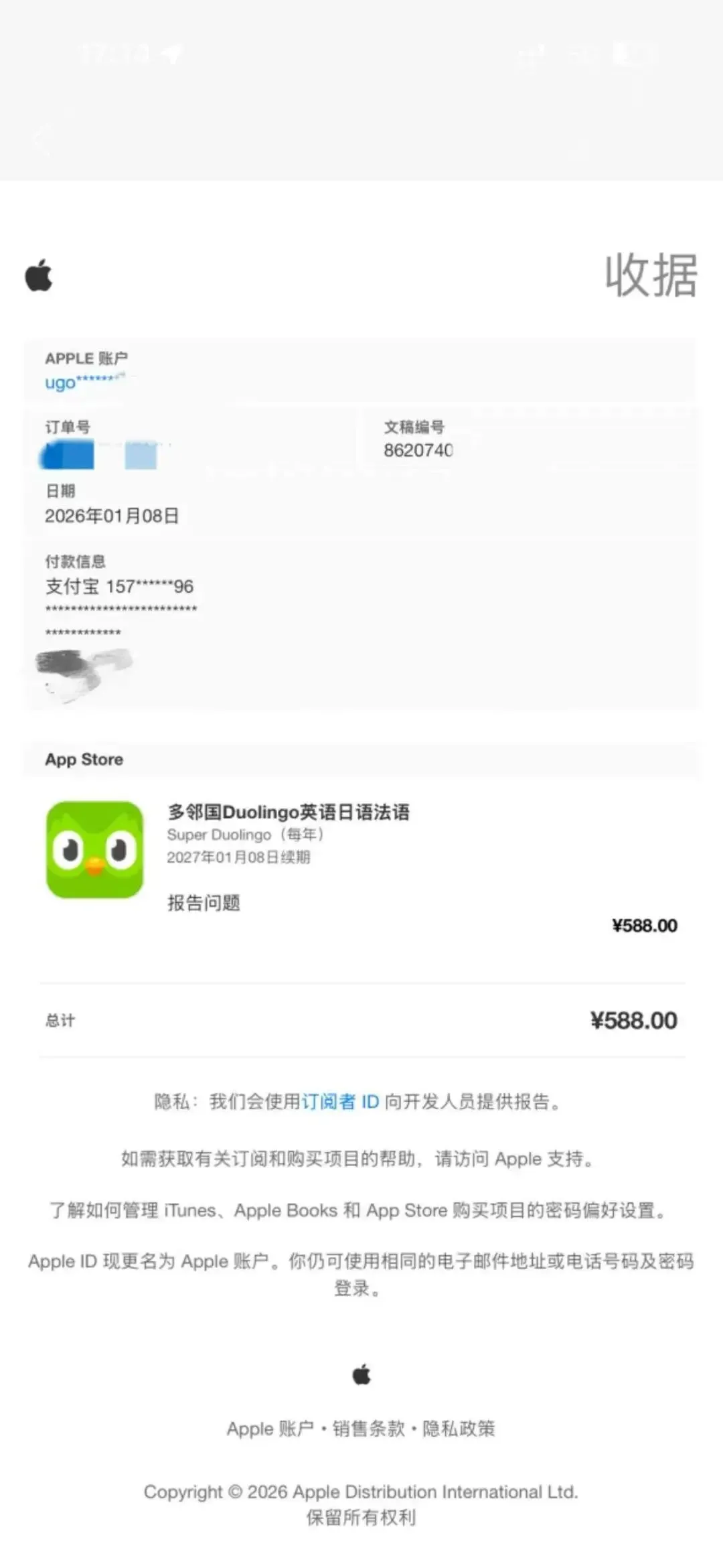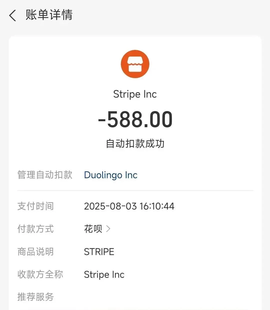 卢同学告诉极目新闻记者,扣款前,她并未收到多邻国的任何通知提醒,她回想起开通免费体验时,多邻国曾要求她扫脸支付通过Applepay确认,当时后台显示消费明细是0,但当她发现被直接扣款后,再找当时这笔0元消费明细时,却不见了,显示的只是588元的实际扣款。