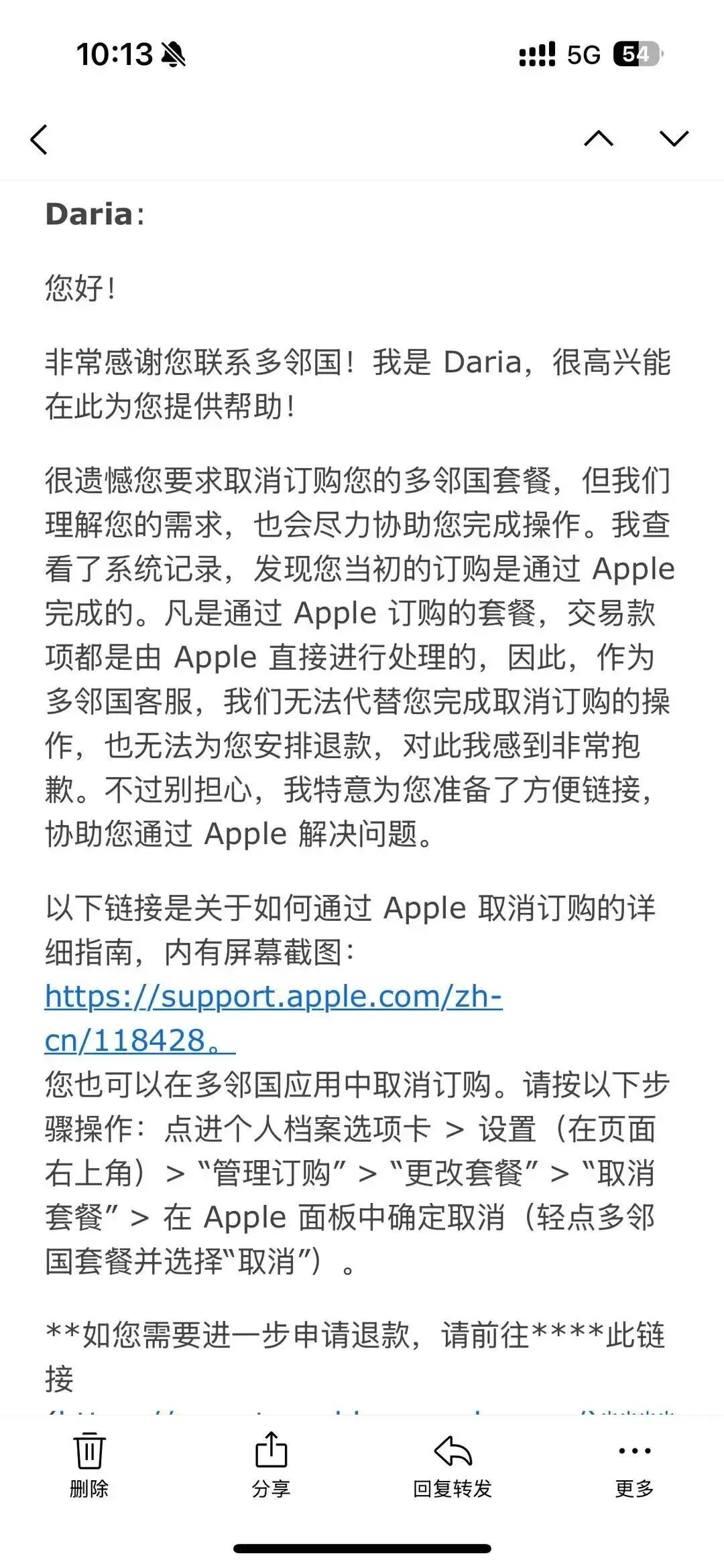 在卢同学向多邻国发送邮件要求取消套餐后,工作人员很快在邮件中回复她:“很遗憾您要求取消订购您的多邻国套餐,但我们理解您的需求,也会尽力协助您完成操作。我查看了系统记录,发现您当初的订购是通过Apple完成的。凡是通过Apple订购的套餐,交易款项都是由Apple直接进行处理的,因此,作为多邻国客服,我们无法代替您完成取消订购的操作,也无法为您安排退款,对此我感到非常抱歉。”