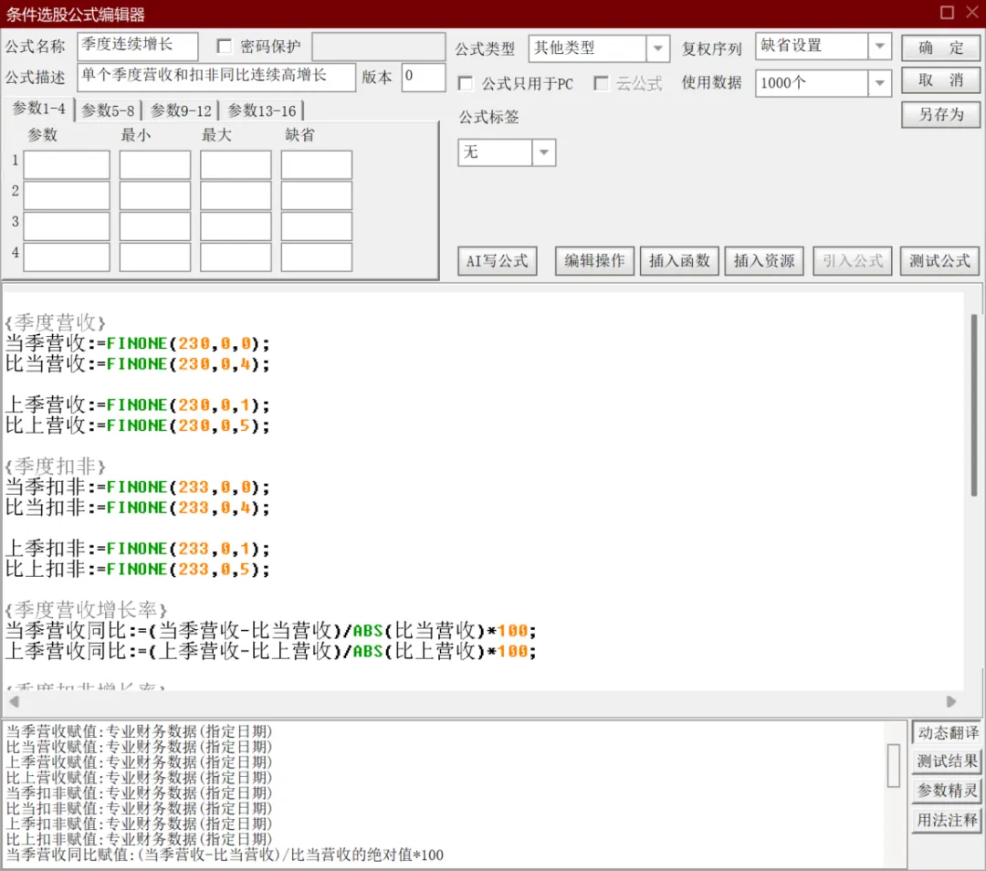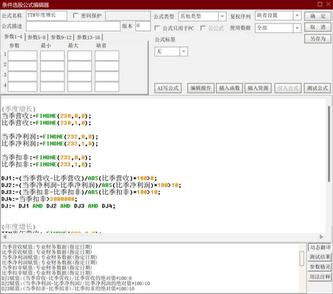 {季度增长}当季营收:=FINONE(230,0,0);比季营收:=FINONE(230,1,0);当季净利润:=FINONE(232,0,0);比季净利润:=FINONE(232,1,0);当季扣非:=FINONE(233,0,0);比季扣非:=FINONE(233,1,0);DJ1:=(当季营收-比季营收)/ABS(比季营收)*100>8;DJ2:=(当季净利润-比季净利润)/ABS(比季净利润)*100>10;DJ3:=(当季扣非-比季扣非)/ABS(比季扣非)*100>10;DJ4:=当季扣非>3000000;DJ:= DJ1 AND DJ2 AND DJ3 AND DJ4;{年度增长}TTM当年营收:=FINONE(283,0,0);TTM比年营收:=FINONE(283,1,0);TTM当年扣非:=FINONE(309,0,0);TTM比年扣非:=FINONE(309,1,0);TN1:=(TTM当年营收-TTM比年营收)/ABS(TTM比年营收)*100>5;TN2:=(TTM当年扣非-TTM比年扣非)/ABS(TTM比年扣非)*100>8;TN3:=TTM当年扣非 >1000; {TTM当年扣非净利润大于1000万}TN:= TN1 AND TN2 AND TN3;TJN: TN AND DJ;