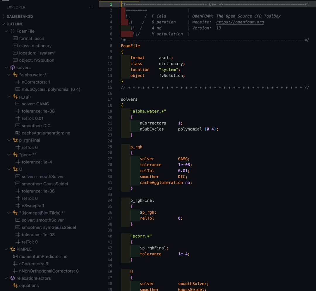 插件 OpenFOAM Dictionary Support 兼具案例关键字高亮、编程环境配置等功能,能够完美替代上面的插件。而且此插件非常新(官方仓库看是三个月前首发的,最近更新时间是2025-12-30),能够最大化地兼容最新的OpenFOAM版本。