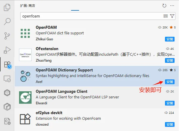 直接在扩展程序面板中搜索 OpenFOAM 即可找到。