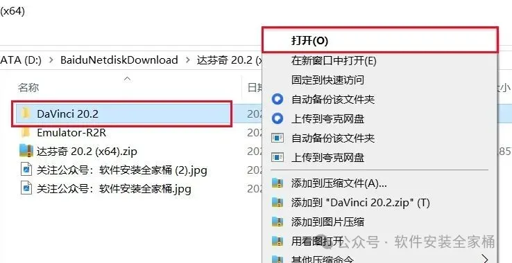 1.打开下载的达芬奇软件安装包,鼠标右击压缩包选择【解压到当前文件夹】。
