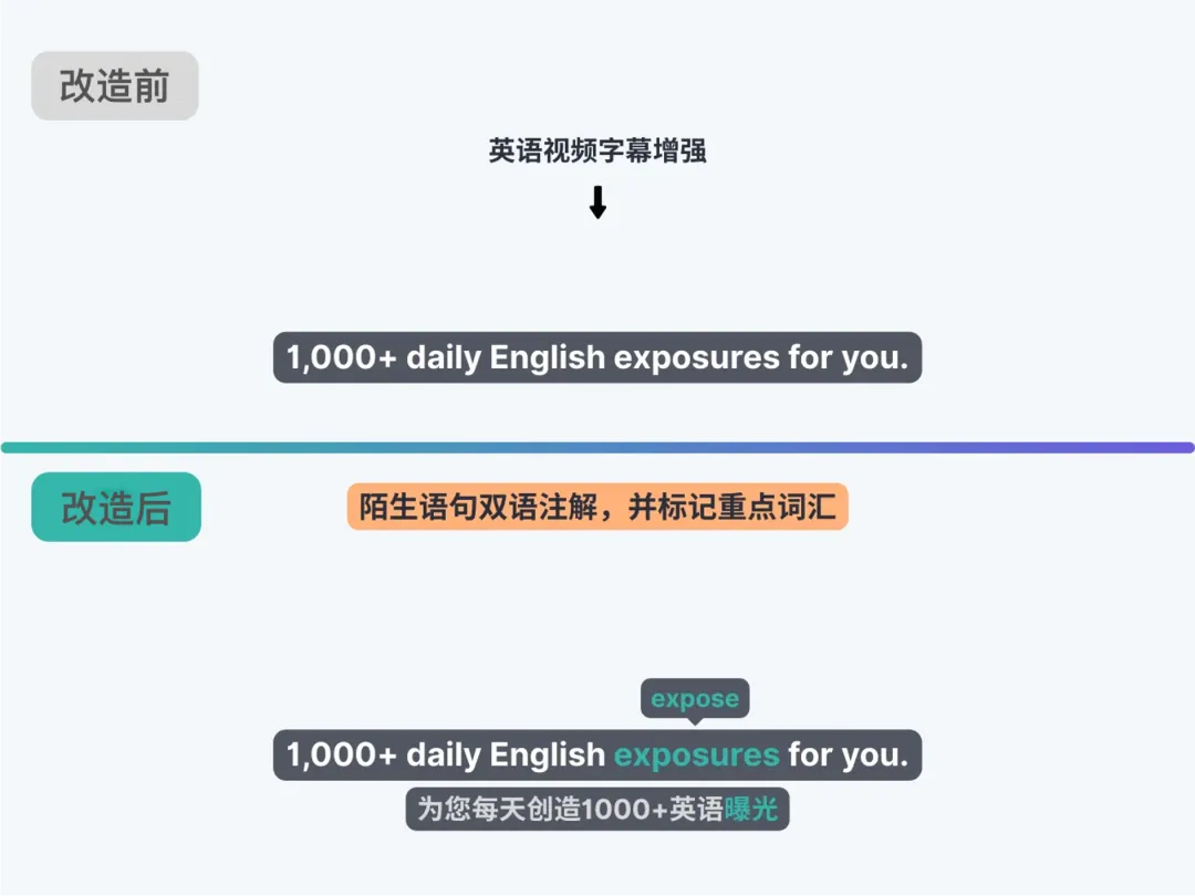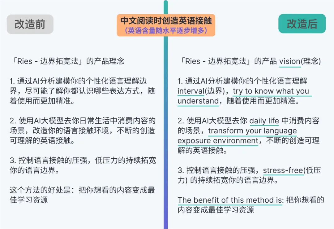 通过大数据建模用户的语言理解边界,了解用户对外语的理解程度;然后通过 AI 改造用户常看内容的语言,带来中英混合的接触环境。