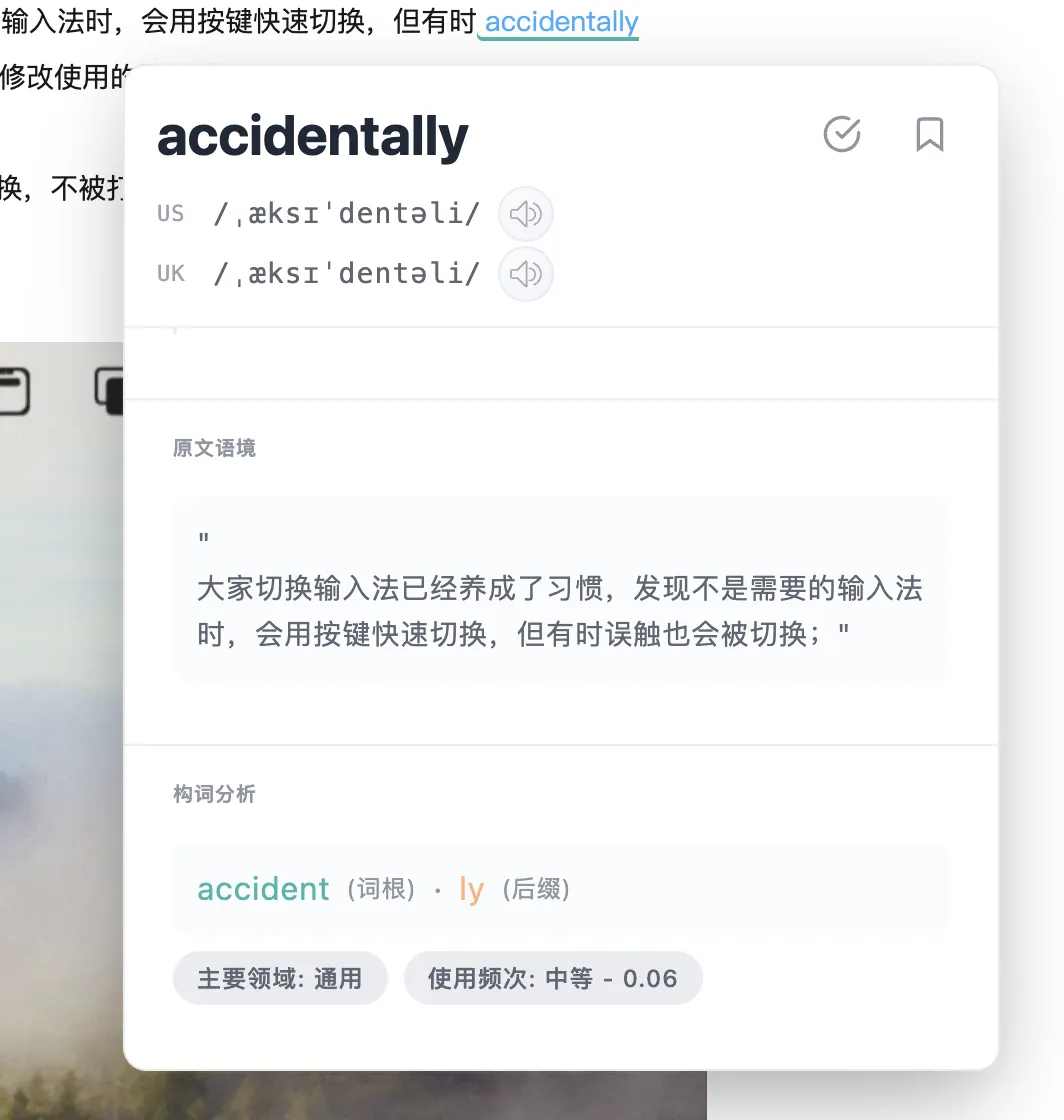 遇到生词与表达,放置鼠标到修改后的英文处,即时标注解释、给出示例用法,无需频繁查词也不打断浏览。