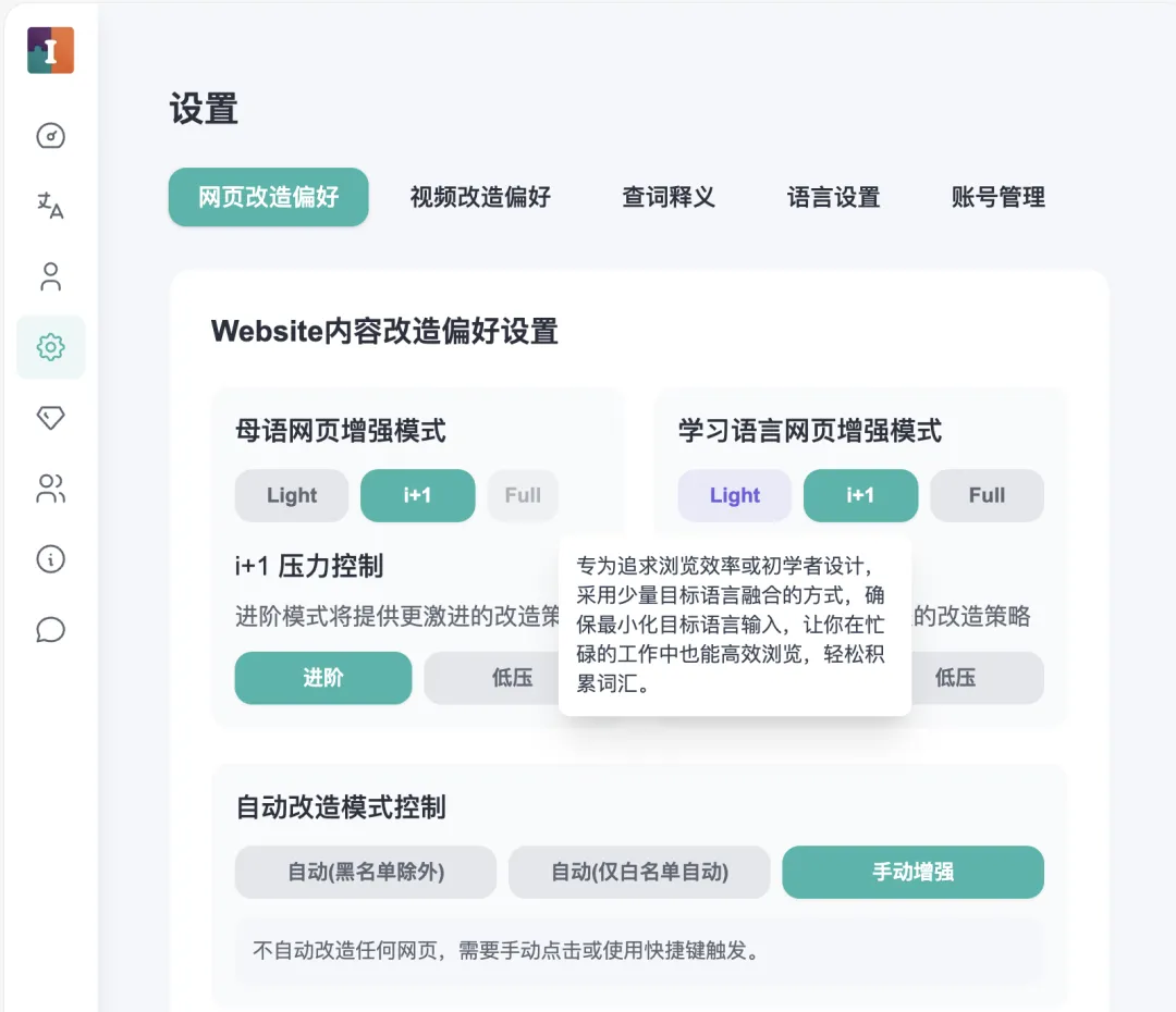 可以按照自己的词汇量,调节不同的翻译模式:简单词保留、难词翻译,控制难易度不再只会看全局翻译内容。