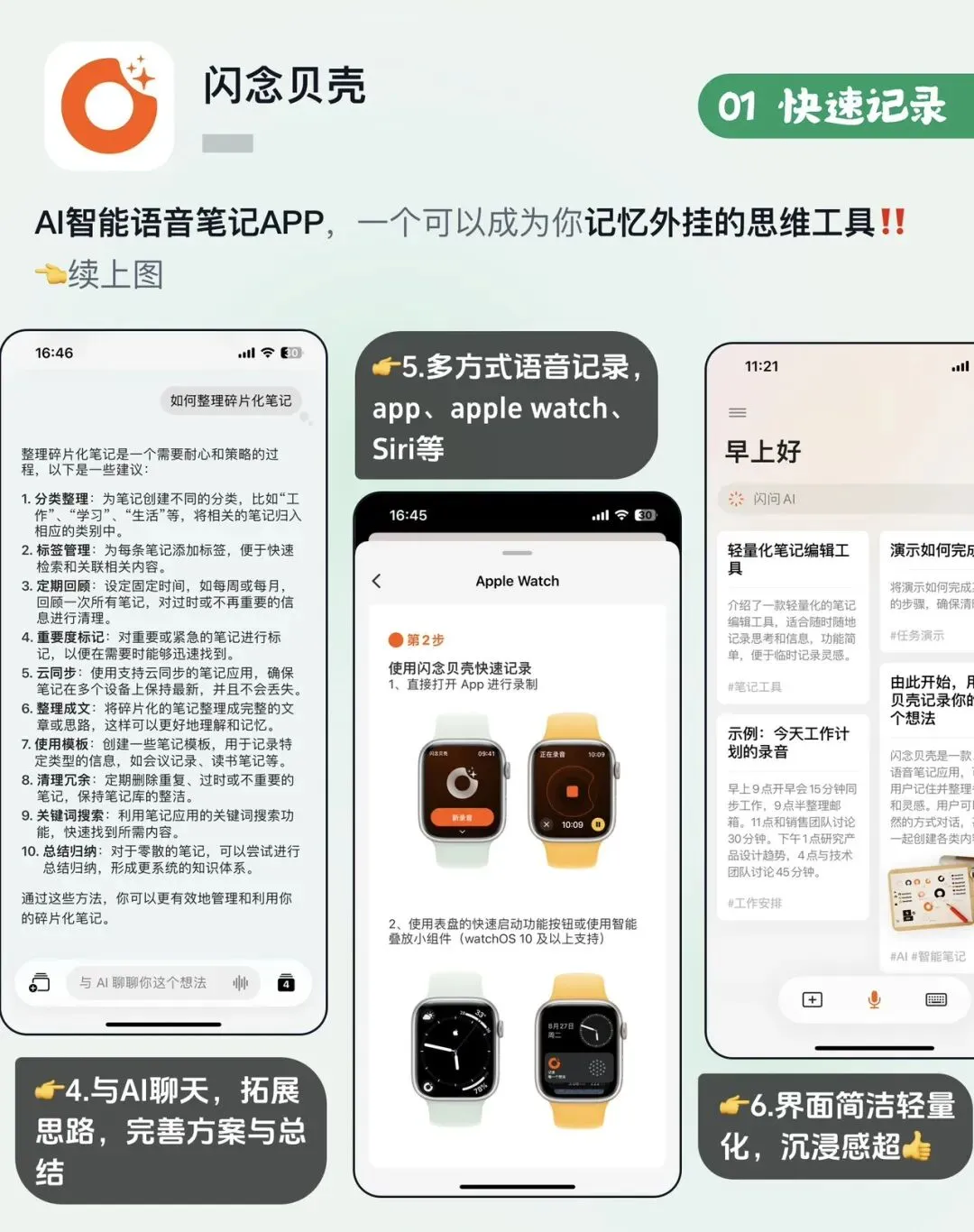 🟠Al智能语音笔记APP,一个可以成为你记忆辅助的免费思维工具!!上班族可以用它进行会议纪要、方案思路整理和产出等;平时可以用来记录碎片化信息或突发灵感思路。它有以下回个我觉得很不错的小特色: