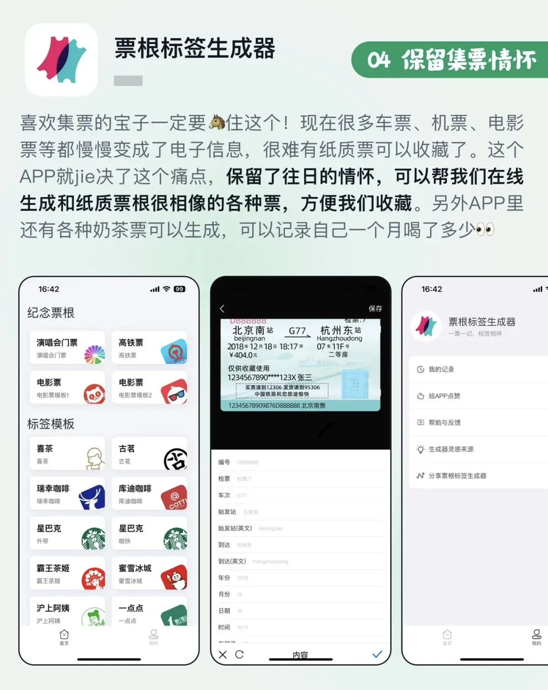 🟠喜欢集票的宝子一定要今住这个!现在很多车票、机票、电影票等都慢慢变成了电子信息,很难有纸质票可以收藏了。这个APP就jie决了这个痛点,保留了往日的情怀,可以帮我们在线生成和纸质票根很相像的各种票,方便我们收藏。另外APP里还有各种奶茶票可以生成,可以记录自己一个月喝了多少