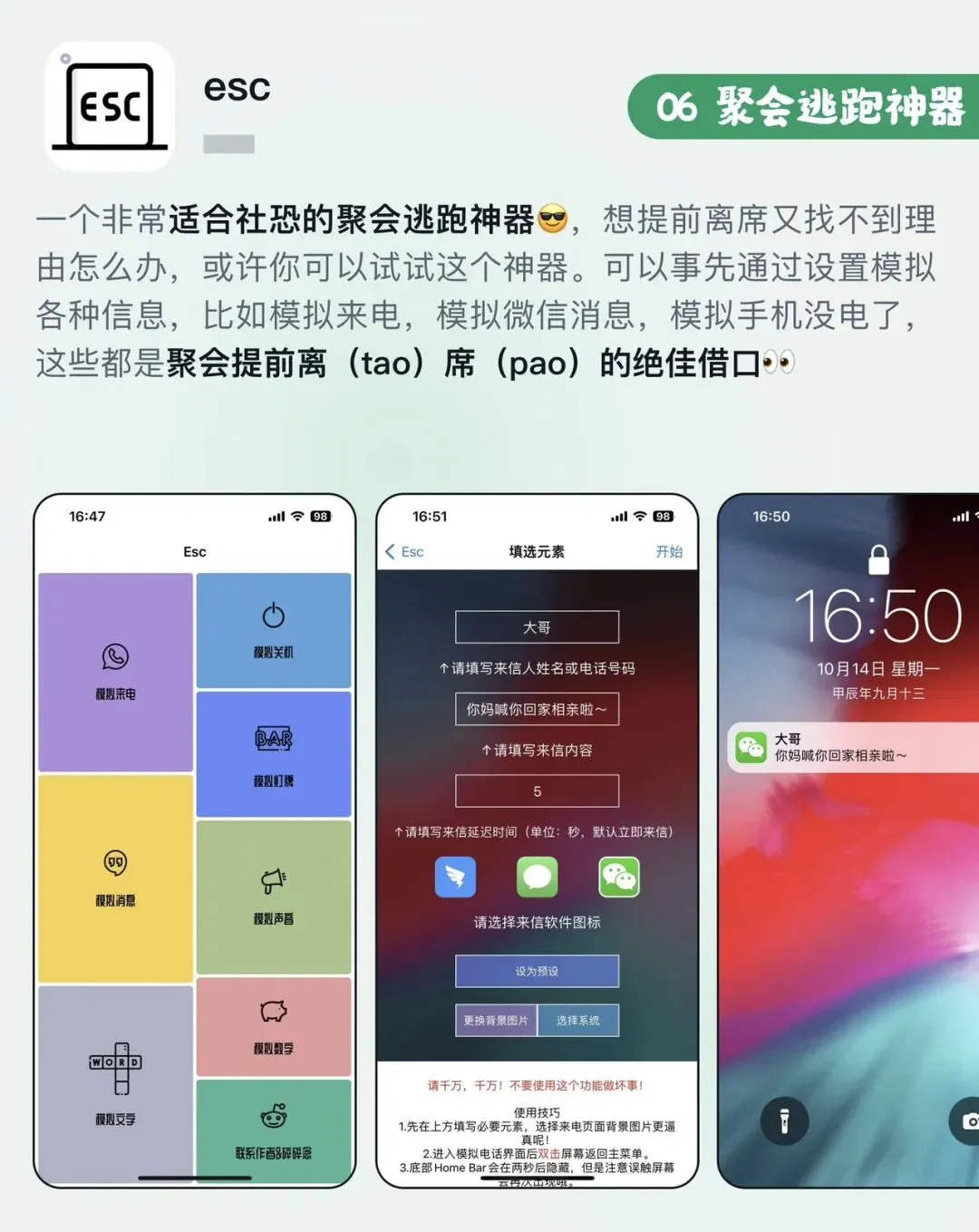 🟠一个非常适合社恐的聚会逃跑神器©,想提前离席又找不到理由怎么办,或许你可以试试这个神器。可以事先通过设置模拟各种信息,比如模拟来电,模拟微信消息,模拟手机没电了,这些都是聚会提前离 (tao)席(pao)的绝佳借口。