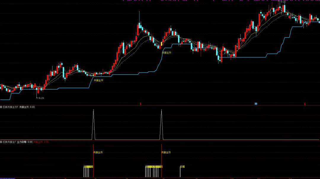 DRAWTEXT(FILTER(共振主升条件,3),(LOW)*(0.99000001),’ 共振主升’),COLOR00FFFF;