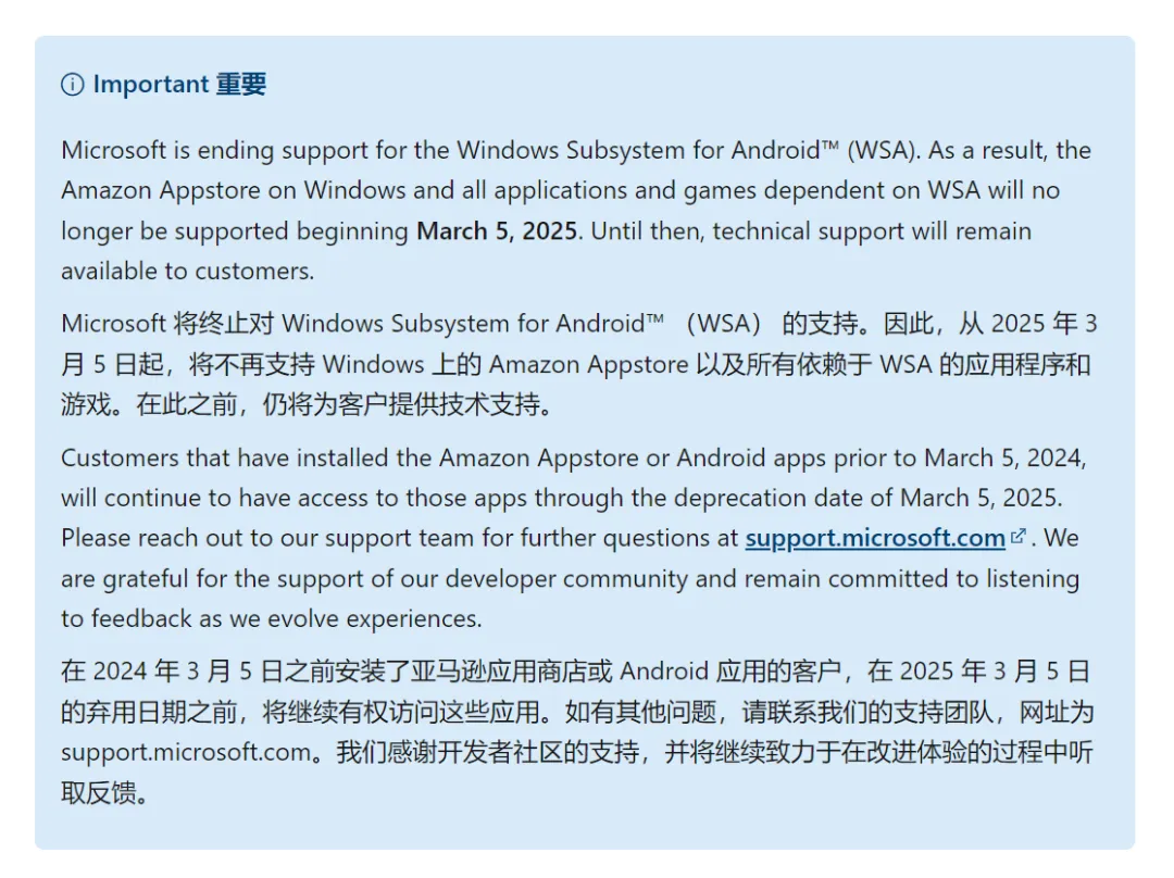 微软将终止对安卓子系统(Windows Subsystem for Android,简称 WSA)的支持。