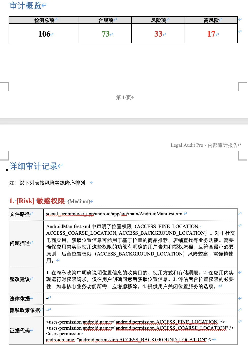 1.精准定性,拒绝模糊: 我的审计报告直接进入代码层。不再说“可能存在违规”,而是直接指出: 在某版本、某模块、哪一行代码、哪个 SDK 初始化逻辑,触发了监管通报中的违规项。 这种颗粒度的分析能够让法务看到法律风险,能让开发人员直接找到需要修改的代码,能让整改意见在 24 小时内就下达到程序员的开发工单上,而不需要再经过N个人的翻译。