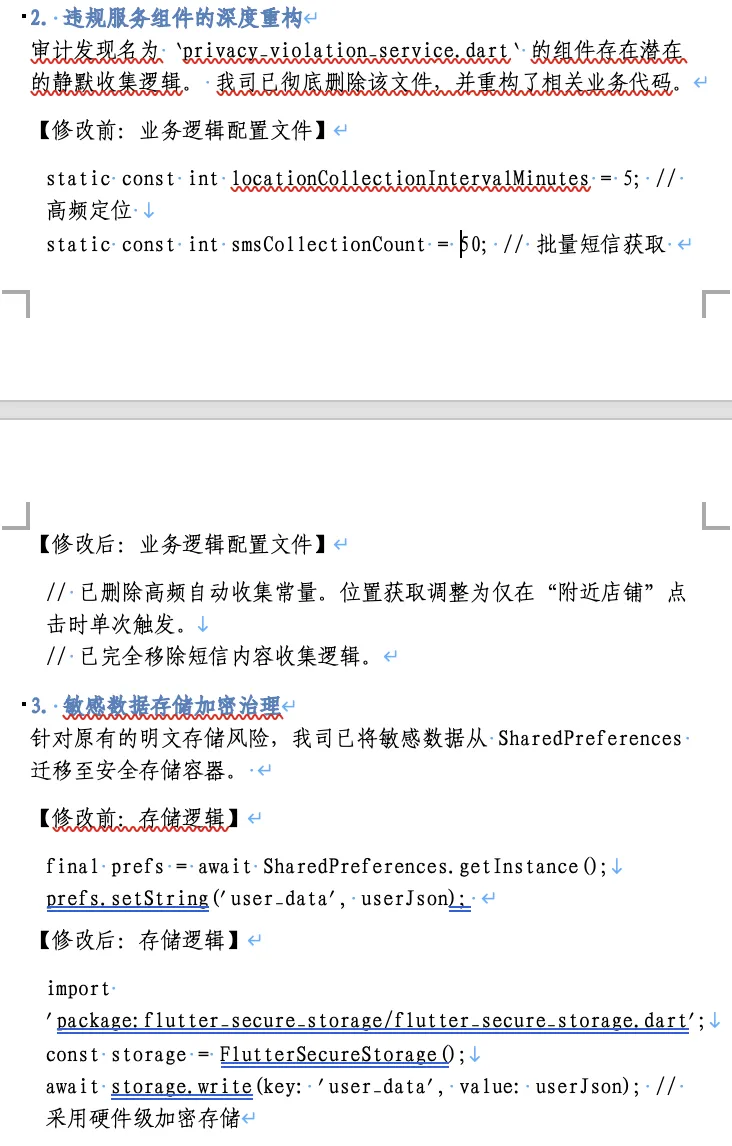 2.用监管的语言说服监管: 监管机构的专家在审核整改报告时,看的是证据。而我的整改报告会包含: 整改前后的 API 调用日志对比、代码片段对比,灰度测试下的数据流向分析、以及针对争议项的法理推演。 当我们能清晰地向监管展示“该调用属于核心业务逻辑所必须,且已通过何种技术手段限制了收集频率”时,这种基于技术事实的抗辩,才是最强有力的说服。
