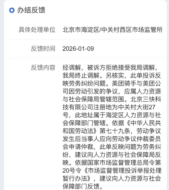 给我的反馈是:劳动纠纷,应该属于人力资源与社会保障局管理管辖。不是美团与骑手不是没有劳务关系吗?不是定性为平等民事合作关系吗?好,到此为止我,我窝囊,我无能,我撤退。