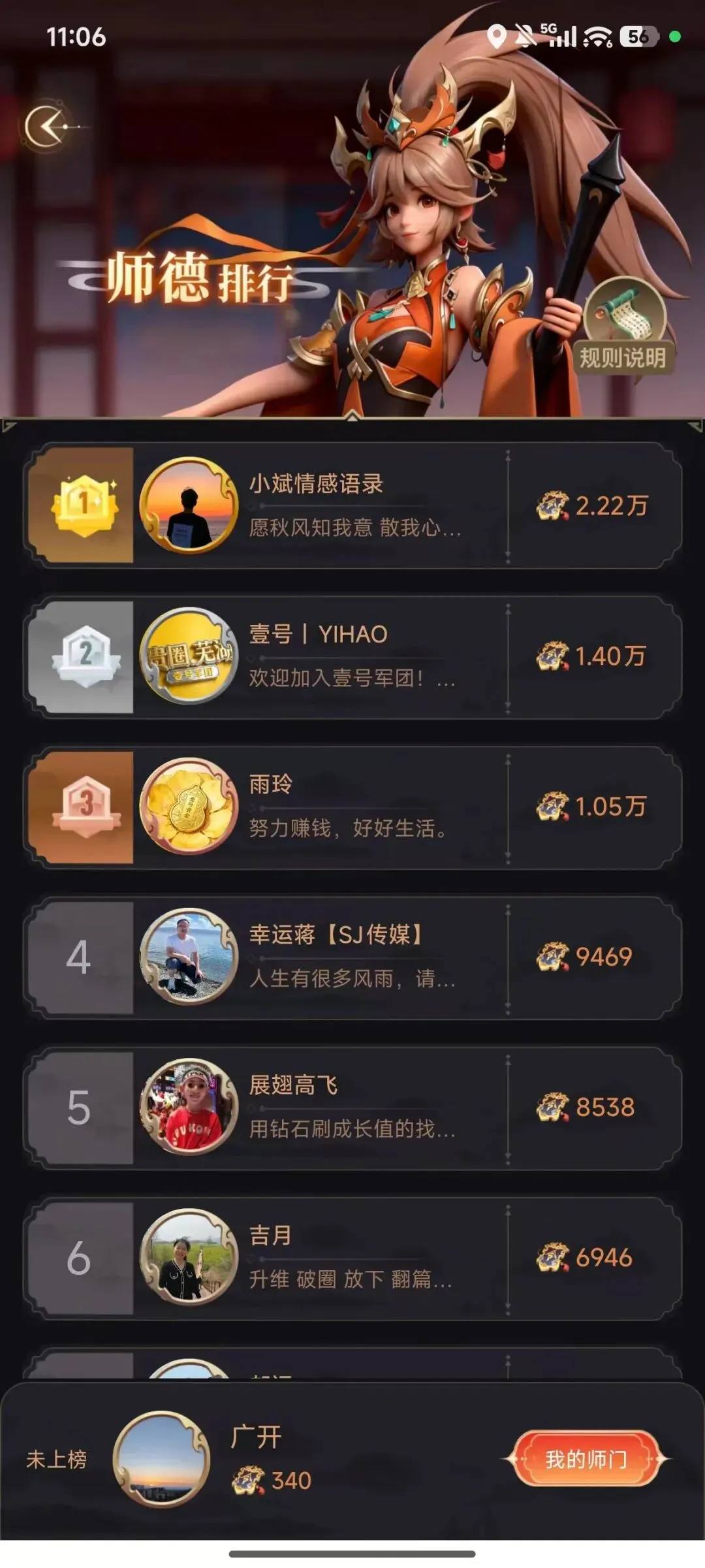 师德榜,按照师德值进行排名,师德值与徒弟成长值实时挂钩(徒弟每获得1个成长值师傅增加1点师德值)