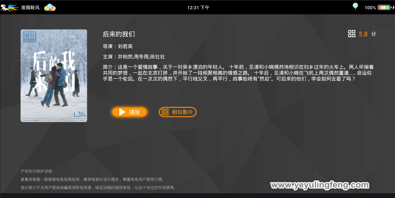 测试条件有限,老夜只在虚拟机中测试了一波,应用内视频很广泛更新也快,就拿上面截图中的《后来的我们》来说,算是最近的热门大片了,各大视频站都需要付费观看的而星集视频直接免费观影,至于为什么免费相信大家都心知肚明,原理跟老夜的视频站类似。关于如何安装到电视上这里就不写教程了(过于简单此处省略1000字),星集视频在泛滥的直播应用中算是最简单纯粹的了,清爽且无广告,免费还不流氓,如果日后更新升级后还能保持这样,确实不失为一款良心应用了!