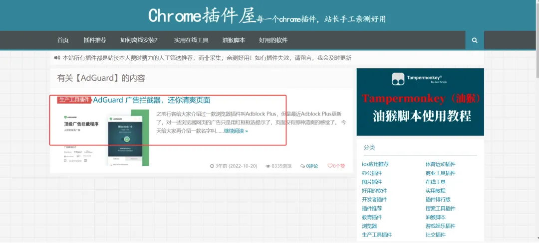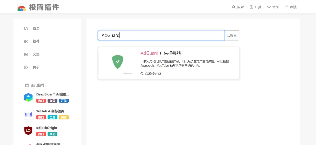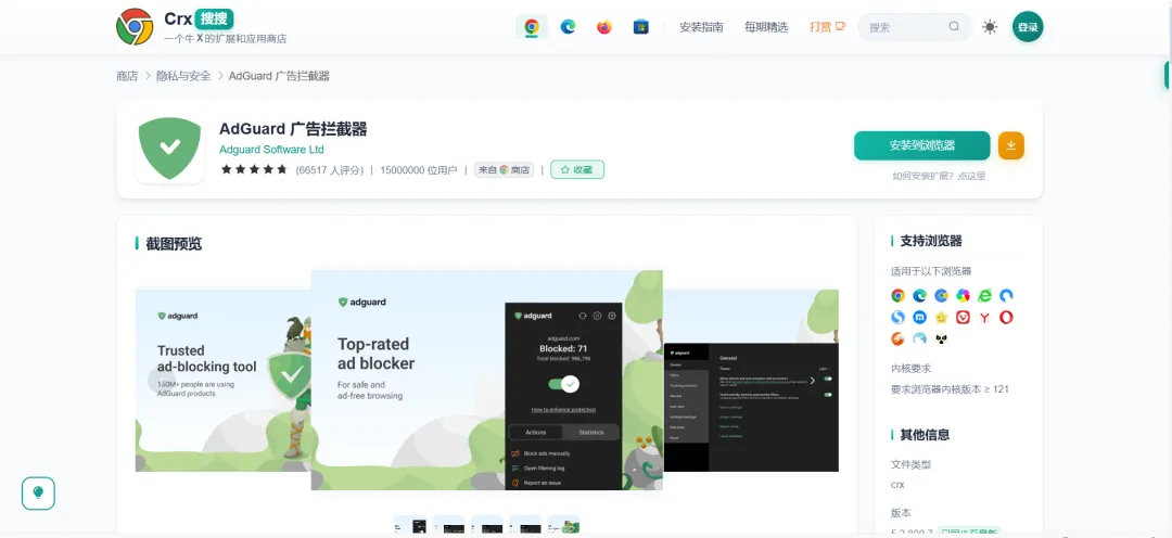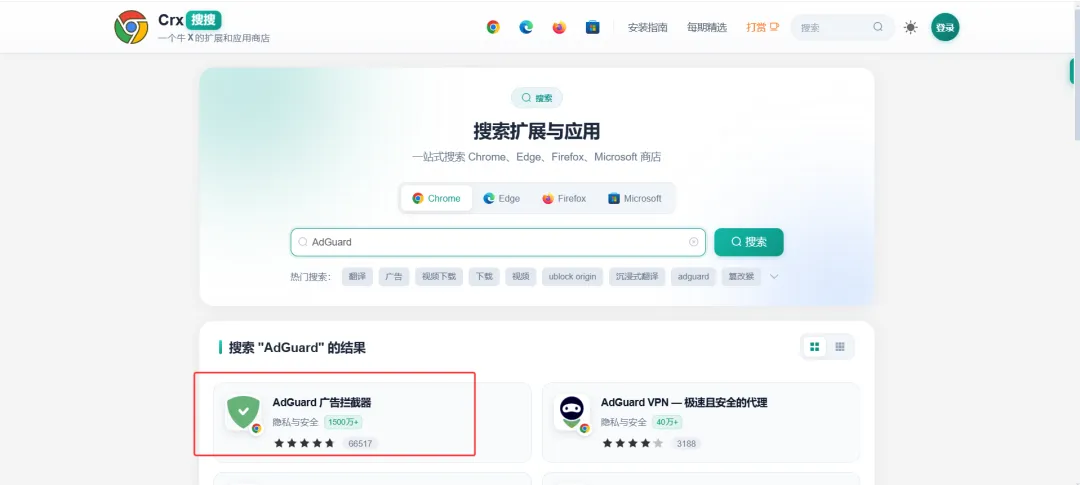 接着在搜索框搜索对应的插件即可,如:ADGuard,输入并确认后出现如下搜索记录: