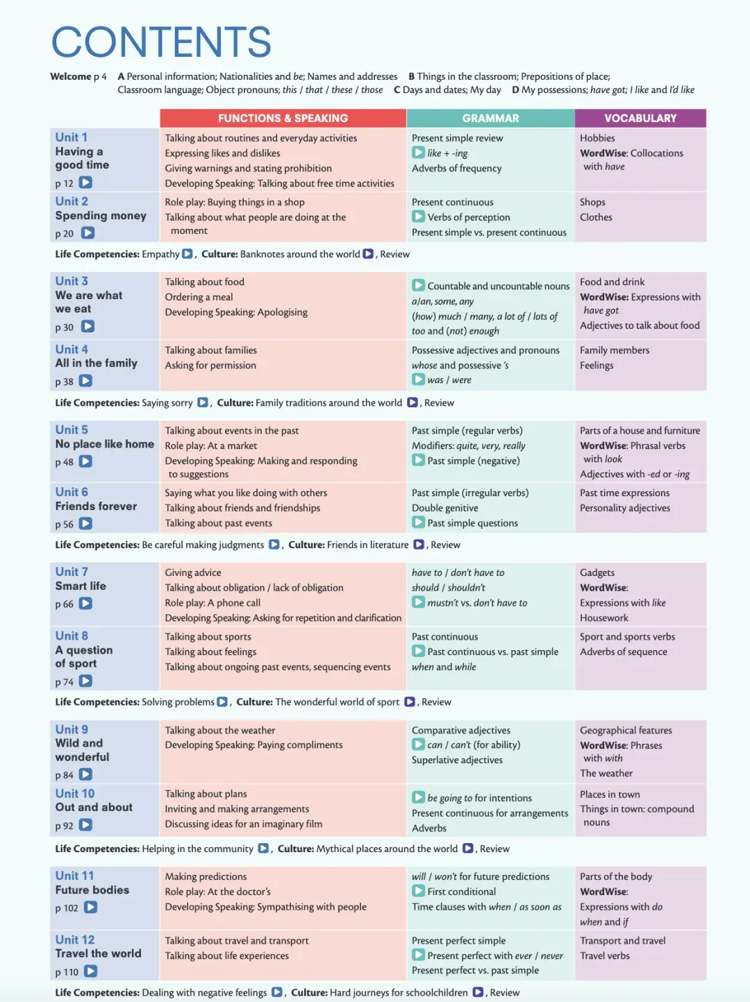 1️⃣12个单元为:课堂引入、两个阅读、口语、两个语法点、两个词汇部分、文化部分或图片故事、日常用语练习;