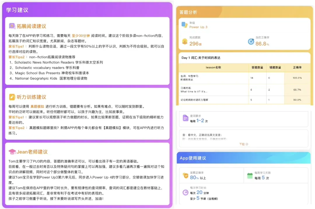 至于咱们关心的“孩子学得怎么样”,刺猬英语也给出了贴心的解决方案。
