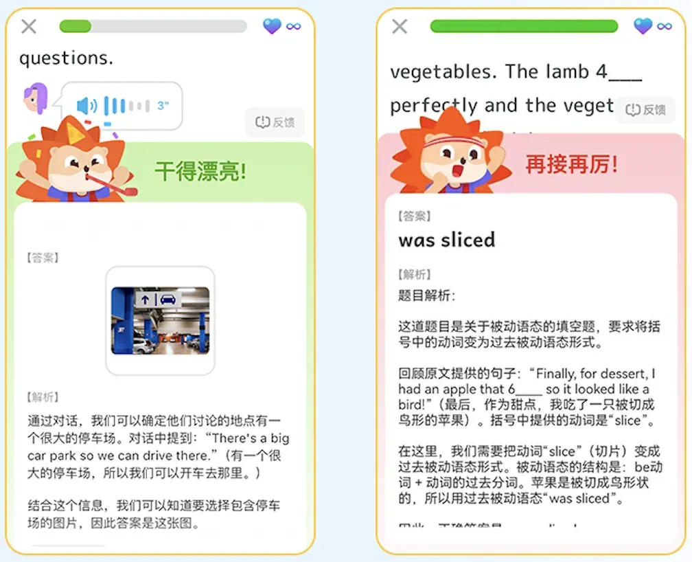 当孩子阅读/听力理解题正确率不高时,系统会根据做题正确率,自动弹出“刺猬开小灶” 模块。