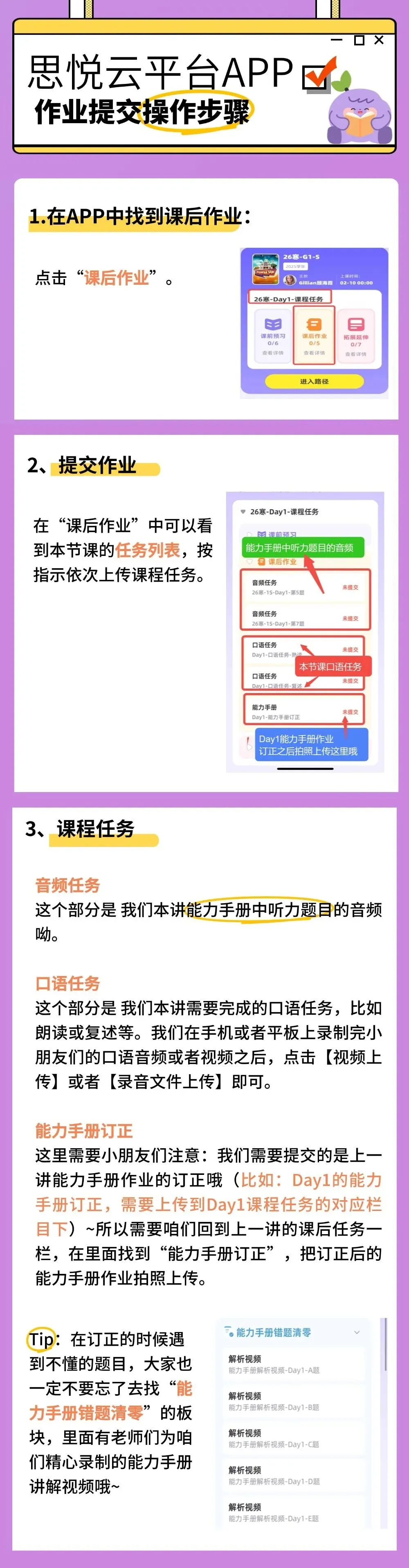 作业是帮助我们复习和运用课堂知识的好方法。“思悦云学习平台”上有两种最常见的课后作业需要你提交。