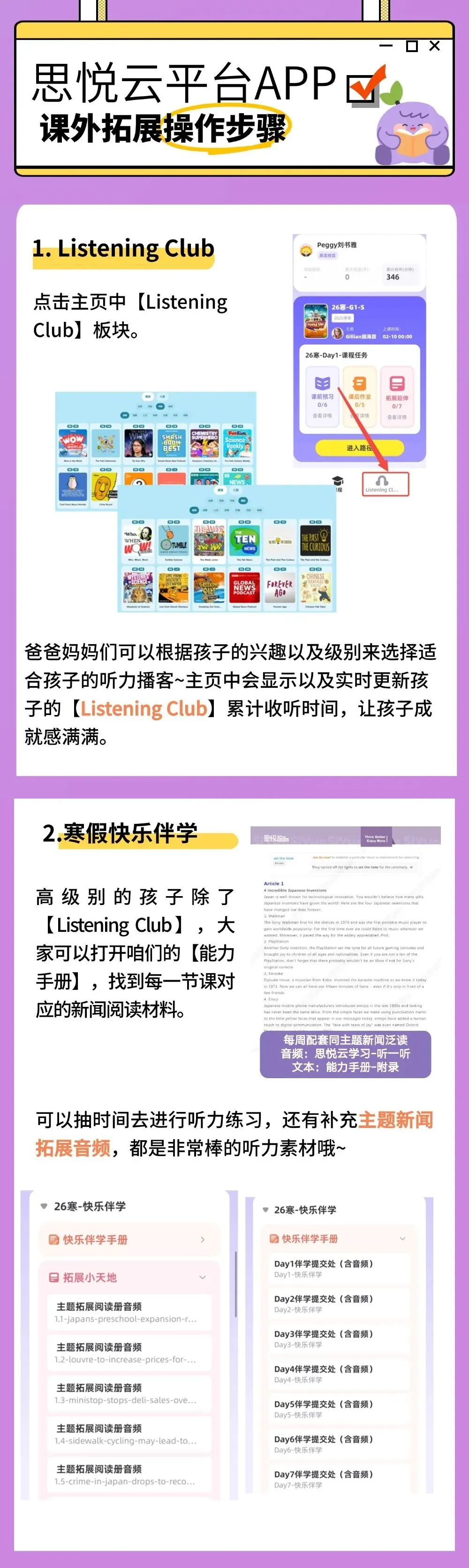 新增快乐伴学手册、拓展小天地、能力手册错题清零三大学习模块,新增课后作业朗读任务语音跟读功能(目前幼儿、1A已上线,持续更新中!) 修复闪退、Listening Club 时长自动刷新