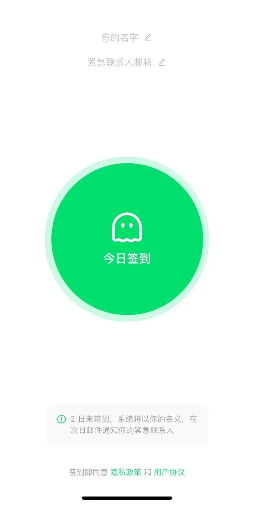 它的名字撞脸“饿了么”,带着一丝人生戏谑;它的绿色幽灵式图标,透着一股亚文化的“丧”;它的功能,极简到只需填个邮箱,每天点个“签到”,断签两天,帮发邮件通知紧急联系人。
