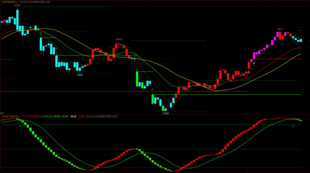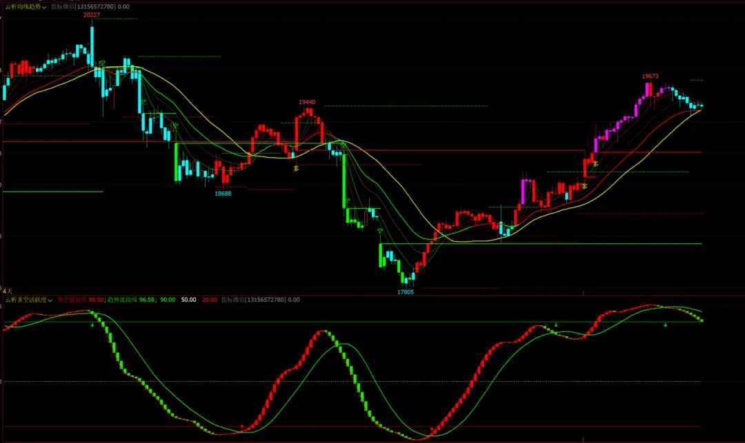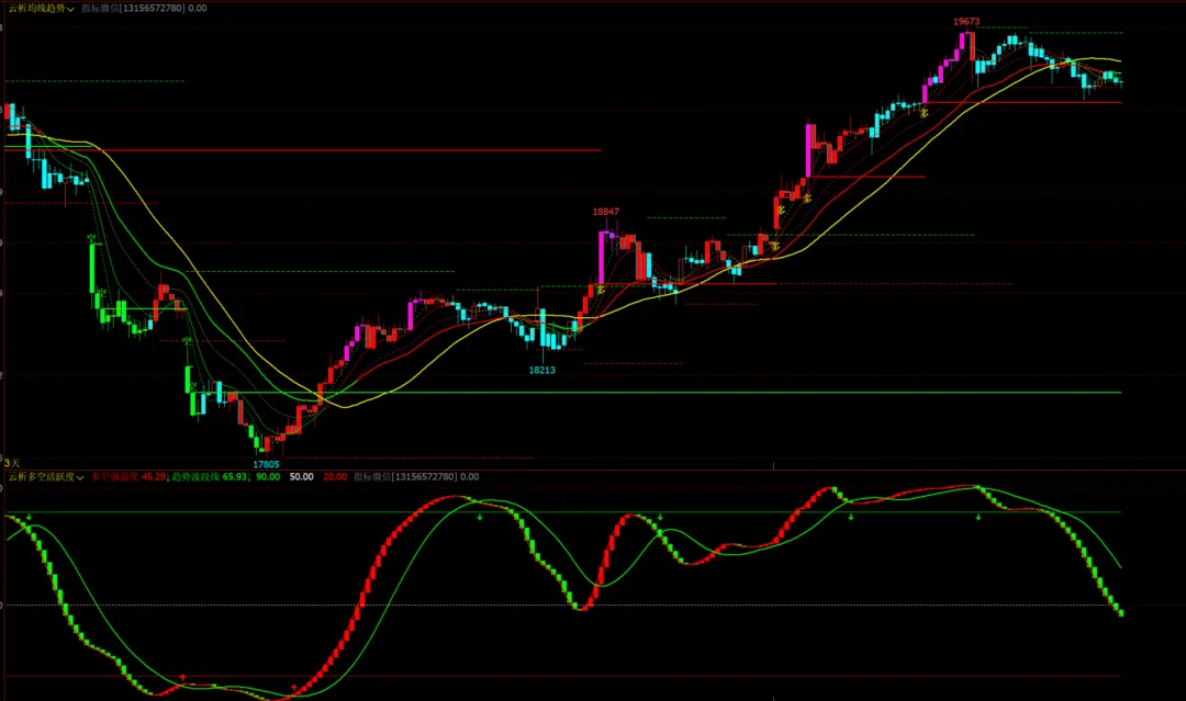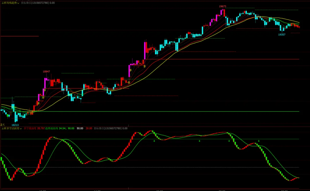 1、指标名称:云析均线趋势主图+云析多空活跃度幅图,主图幅图无未来函数