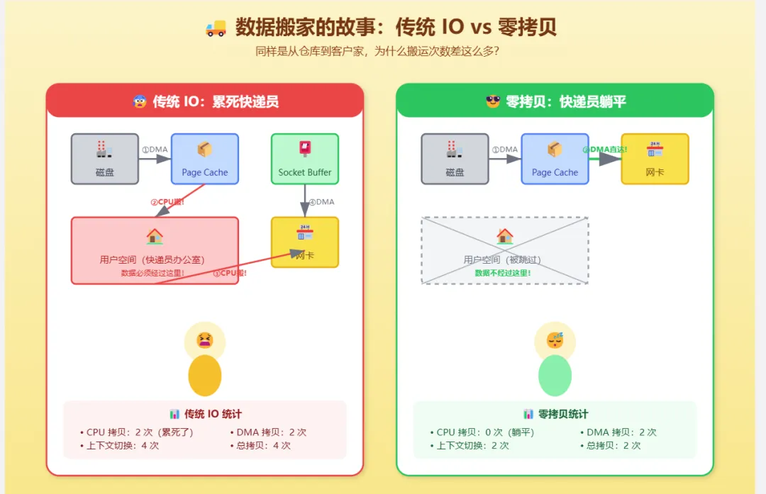假设你是一个快递员(CPU),要把仓库(磁盘)里的包裹送到客户家(网卡)。