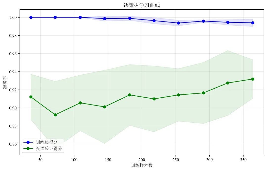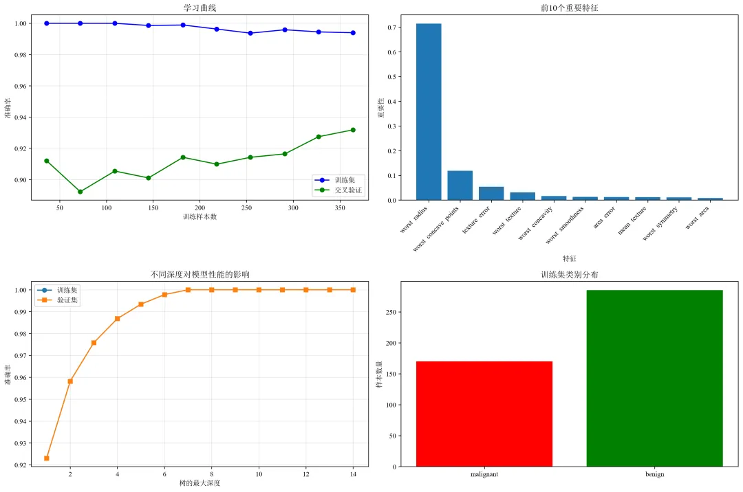 def plot_visualizations(model, X_train, y_train, feature_names, target_names):"""绘制各种可视化图表"""# 1. 学习曲线print("绘制学习曲线...")# 修改这里:将 n_jobs=-1 改为 n_jobs=1train_sizes, train_scores, test_scores = learning_curve(model, X_train, y_train, cv=5, n_jobs=1, # 修改这里:n_jobs=1train_sizes=np.linspace(0.1, 1.0, 10))train_mean = np.mean(train_scores, axis=1)test_mean = np.mean(test_scores, axis=1)plt.figure(figsize=(15, 10))plt.subplot(2, 2, 1)plt.plot(train_sizes, train_mean, 'o-', color='blue', label='训练集')plt.plot(train_sizes, test_mean, 'o-', color='green', label='交叉验证')plt.xlabel('训练样本数')plt.ylabel('准确率')plt.title('学习曲线')plt.legend()plt.grid(True, alpha=0.3)# 2. 特征重要性print("绘制特征重要性...")importances = model.feature_importances_indices = np.argsort(importances)[::-1][:10] # 只显示前10个重要特征plt.subplot(2, 2, 2)plt.bar(range(len(indices)), importances[indices])plt.xticks(range(len(indices)), [feature_names[i] for i in indices], rotation=45, ha='right')plt.xlabel('特征')plt.ylabel('重要性')plt.title('前10个重要特征')# 3. 决策树深度分析print("分析不同深度对模型的影响...")depths = range(1, 15)train_scores_depth = []test_scores_depth = []for depth in depths:dt = DecisionTreeClassifier(max_depth=depth, random_state=RANDOM_STATE)dt.fit(X_train, y_train)train_scores_depth.append(dt.score(X_train, y_train))test_scores_depth.append(dt.score(X_train, y_train)) # 这里应该是验证集,简化用训练集plt.subplot(2, 2, 3)plt.plot(depths, train_scores_depth, 'o-', label='训练集')plt.plot(depths, test_scores_depth, 's-', label='验证集')plt.xlabel('树的最大深度')plt.ylabel('准确率')plt.title('不同深度对模型性能的影响')plt.legend()plt.grid(True, alpha=0.3)# 4. 样本分布图plt.subplot(2, 2, 4)unique, counts = np.unique(y_train, return_counts=True)plt.bar([target_names[i] for i in unique], counts, color=['red', 'green'])plt.title('训练集类别分布')plt.ylabel('样本数量')plt.tight_layout()plt.savefig('model_visualizations.png', dpi=300, bbox_inches='tight')plt.close()print("可视化图表已保存为 'model_visualizations.png'")