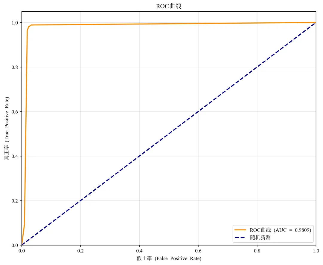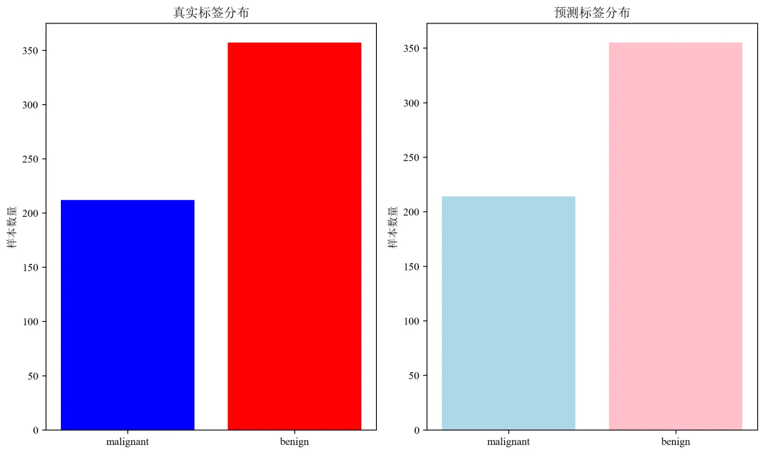 def evaluate_predictions(y_true, y_pred, y_prob, target_names):"""评估预测结果"""# 计算各种指标accuracy = accuracy_score(y_true, y_pred)recall = recall_score(y_true, y_pred, average='weighted')f1 = f1_score(y_true, y_pred, average='weighted')print("=" * 60)print("预测结果评估")print("=" * 60)print(f"准确率 (Accuracy): {accuracy:.4f}")print(f"精确率 (Precision): {precision:.4f}")print(f"召回率 (Recall): {recall:.4f}")print(f"F1分数 (F1-Score): {f1:.4f}")print(f"AUC值: {auc:.4f}")print("\n详细分类报告:")print(classification_report(y_true, y_pred, target_names=target_names))# 绘制ROC曲线fpr, tpr, thresholds = roc_curve(y_true, y_prob)plt.figure(figsize=(10, 8))plt.plot(fpr, tpr, color='darkorange', lw=2, label=f'ROC曲线 (AUC = {auc:.4f})')plt.plot([0, 1], [0, 1], color='navy', lw=2, linestyle='--', label='随机猜测')plt.xlim([0.0, 1.0])plt.ylim([0.0, 1.05])plt.xlabel('假正率 (False Positive Rate)')plt.ylabel('真正率 (True Positive Rate)')plt.title('ROC曲线')plt.legend(loc='lower right')plt.grid(True, alpha=0.3)plt.savefig('roc_curve.png', dpi=300, bbox_inches='tight')plt.close()# 绘制预测结果分布plt.figure(figsize=(10, 6))# 真实标签分布plt.subplot(1, 2, 1)unique, counts = np.unique(y_true, return_counts=True)plt.bar([target_names[i] for i in unique], counts, color=['blue', 'red'])plt.title('真实标签分布')plt.ylabel('样本数量')# 预测标签分布plt.subplot(1, 2, 2)unique_pred, counts_pred = np.unique(y_pred, return_counts=True)plt.bar([target_names[i] for i in unique_pred], counts_pred, color=['lightblue', 'pink'])plt.title('预测标签分布')plt.ylabel('样本数量')plt.tight_layout()plt.savefig('prediction_distribution.png', dpi=300, bbox_inches='tight')plt.close()return {'accuracy': accuracy,'precision': precision,'recall': recall,'f1': f1,'auc': auc,'confusion_matrix': confusion_matrix(y_true, y_pred)}