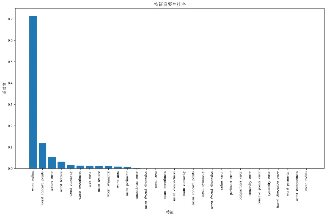 def load_data():"""加载乳腺癌数据集"""data = load_breast_cancer()X = data.datay = data.targetfeature_names = data.feature_namestarget_names = data.target_namesprint(f"数据集形状: {X.shape}")print(f"特征数量: {len(feature_names)}")print(f"类别: {target_names}")print(f"类别分布: 恶性({sum(y==0)}), 良性({sum(y==1)})")return X, y, feature_names, target_namesdef split_data(X, y):"""划分训练集和测试集"""X_train, X_test, y_train, y_test = train_test_split(X, y, test_size=TEST_SIZE, random_state=RANDOM_STATE, stratify=y)print(f"训练集大小: {X_train.shape}")print(f"测试集大小: {X_test.shape}")return X_train, X_test, y_train, y_test
